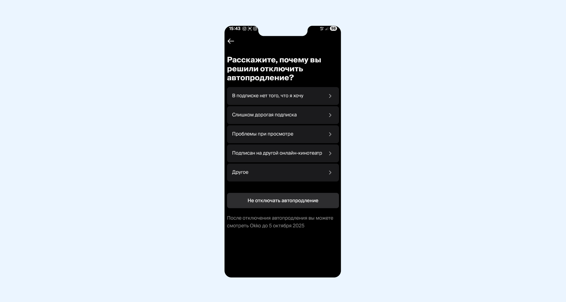 - Выберите причину, по которой вы решили отключить подписку («В подписке нет того, чего я хочу», «Слишком дорогая подписка», «Проблемы при просмотре» и т. д).