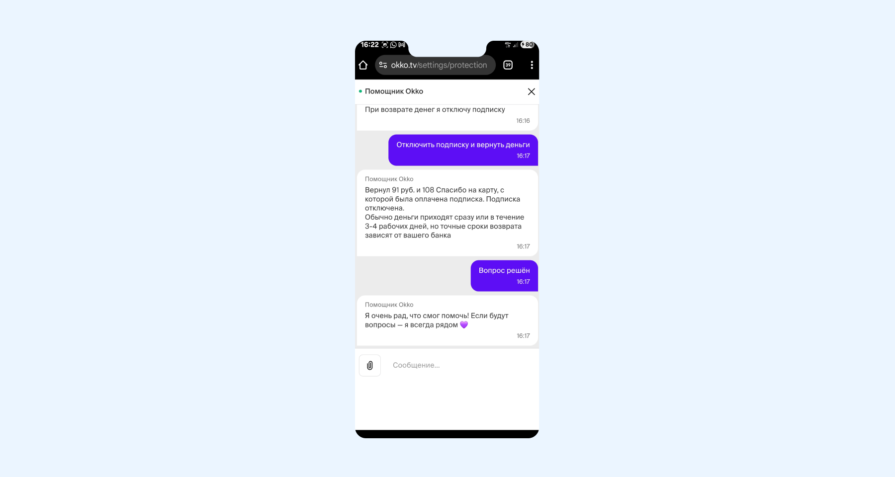Если подписка не была использована, можно обратиться с запросом на возврат средств в чат-поддержку Okko.
