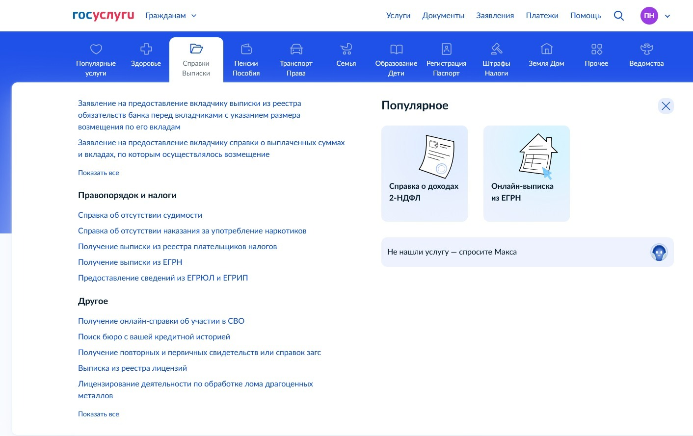 - В верхней панели выберите пункт «Справки Выписки» и прокрутите список услуг вниз до раздела «Другое».