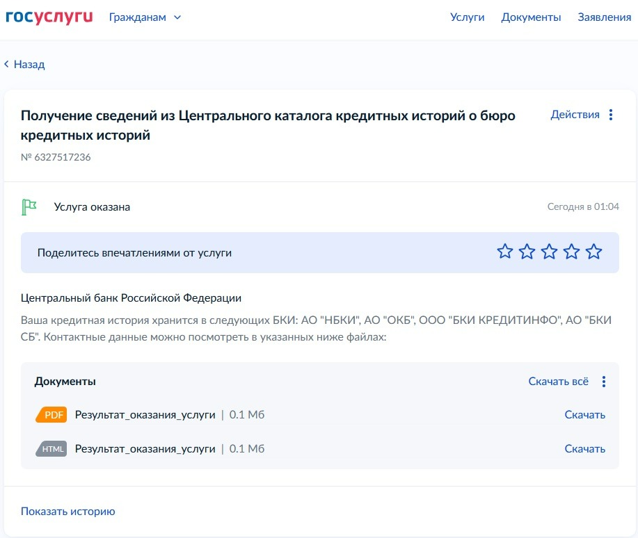 Вы получите уведомление на сайте «Госуслуги», когда услуга будет оказана. В отчете об оказанной услуге будут перечислены БКИ, хранящие вашу кредитную историю. Вы также сможете скачать файл (в формате PDF или HTML), в котором указаны их контактные данные и адреса сайтов.