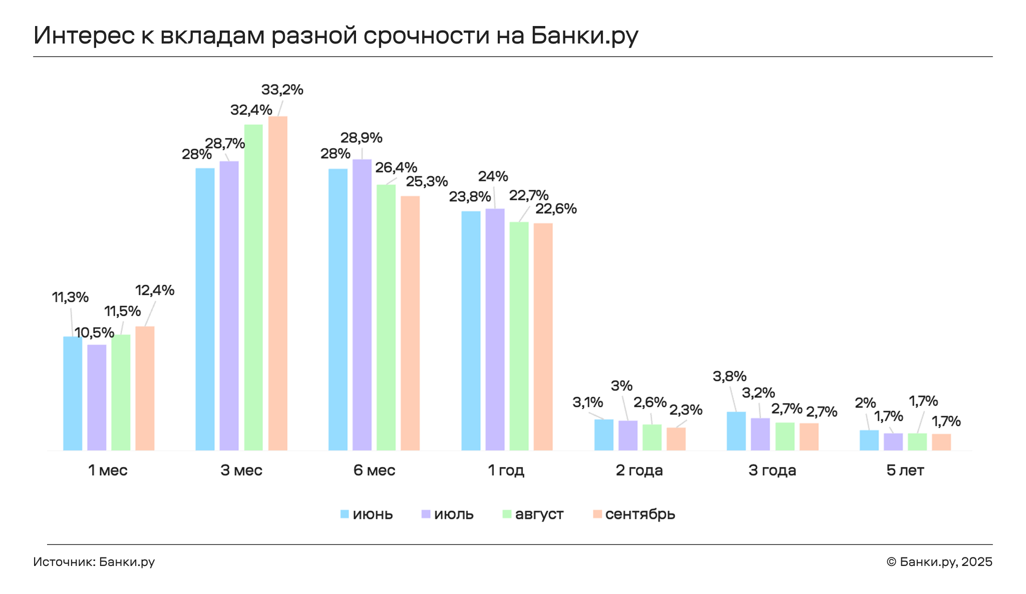 Вклады сроком более года остаются относительно нишевым инструментом: их совокупная доля в спросе не превышает 7 %.