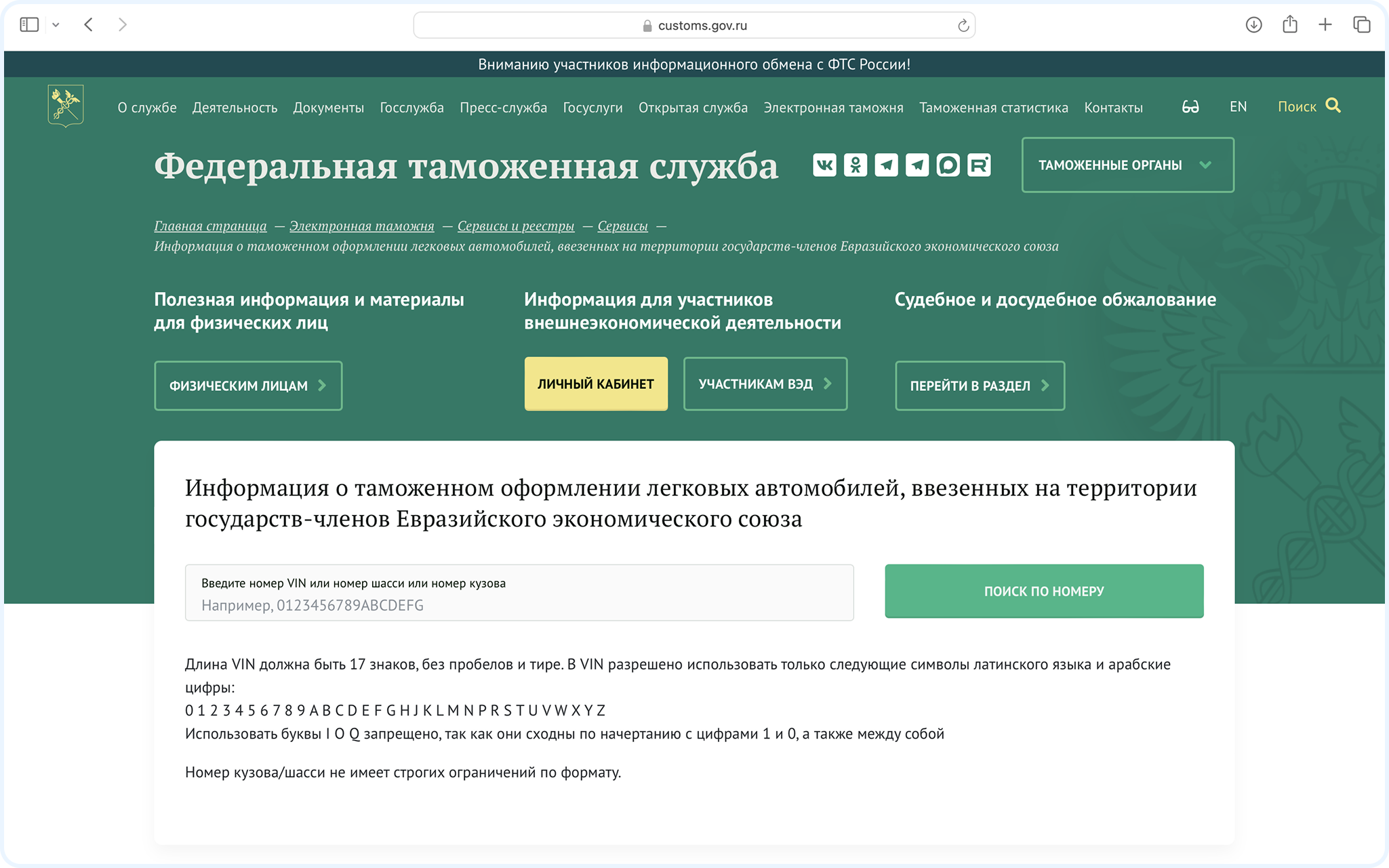 Получить данные о нарушении правил ввоза ТС можно на сайте Таможенной службы. Поиск также ведется по VIN, номеру шасси или номеру кузова.