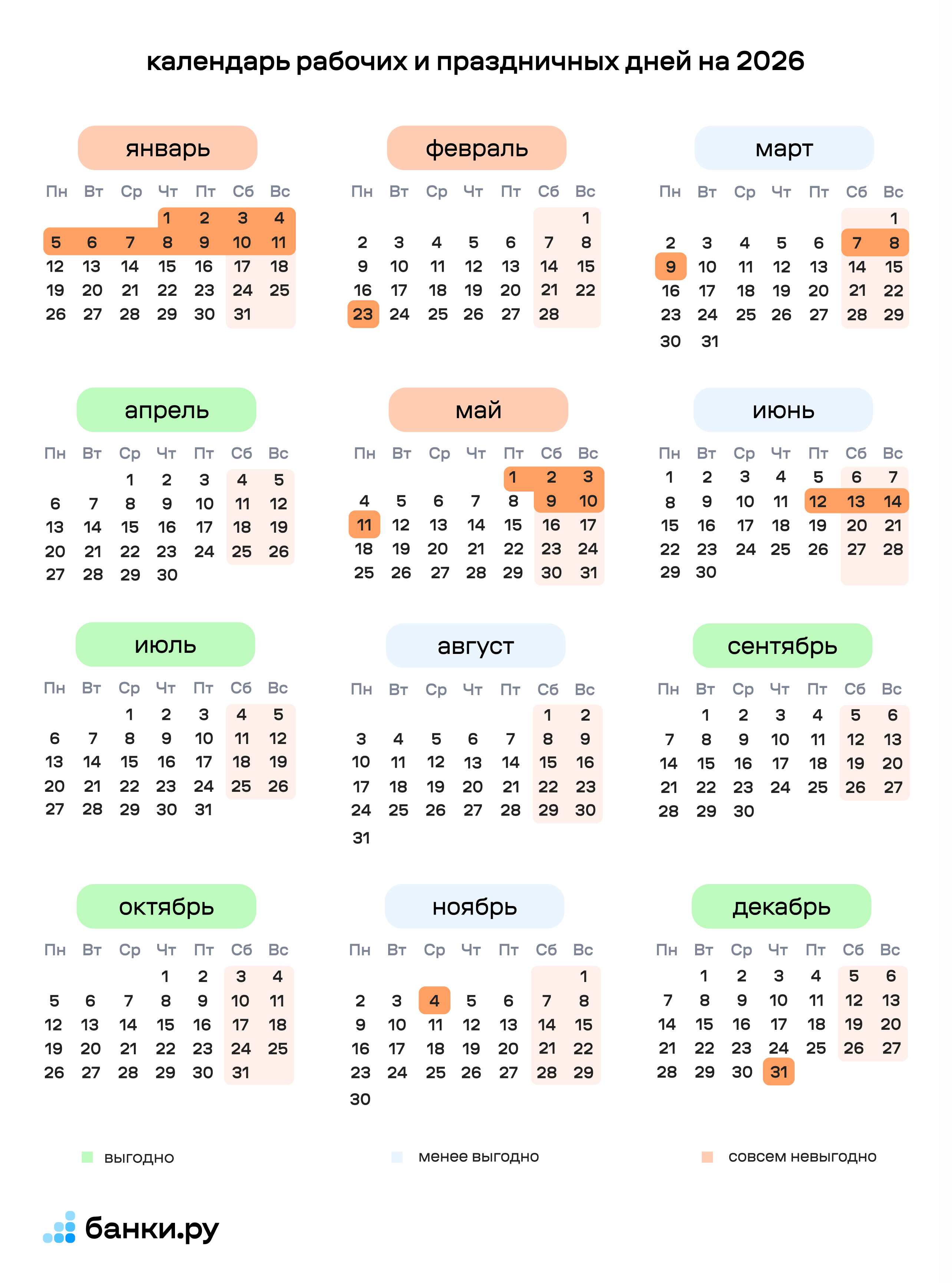 Если нужно больше денег.Больше всего рабочих дней в 2026 году будет в июле — 23 рабочих дня. По 22 дня — в апреле, сентябре, октябре, декабре. Эти месяцы отмечены в календаре зеленым и голубым цветами.