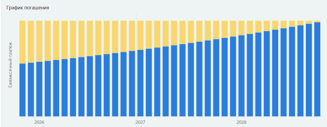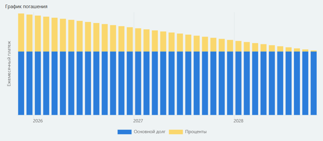 В расчете видно, что процентная часть снижается, часть погашения — растет, а сам платеж остается тем же.