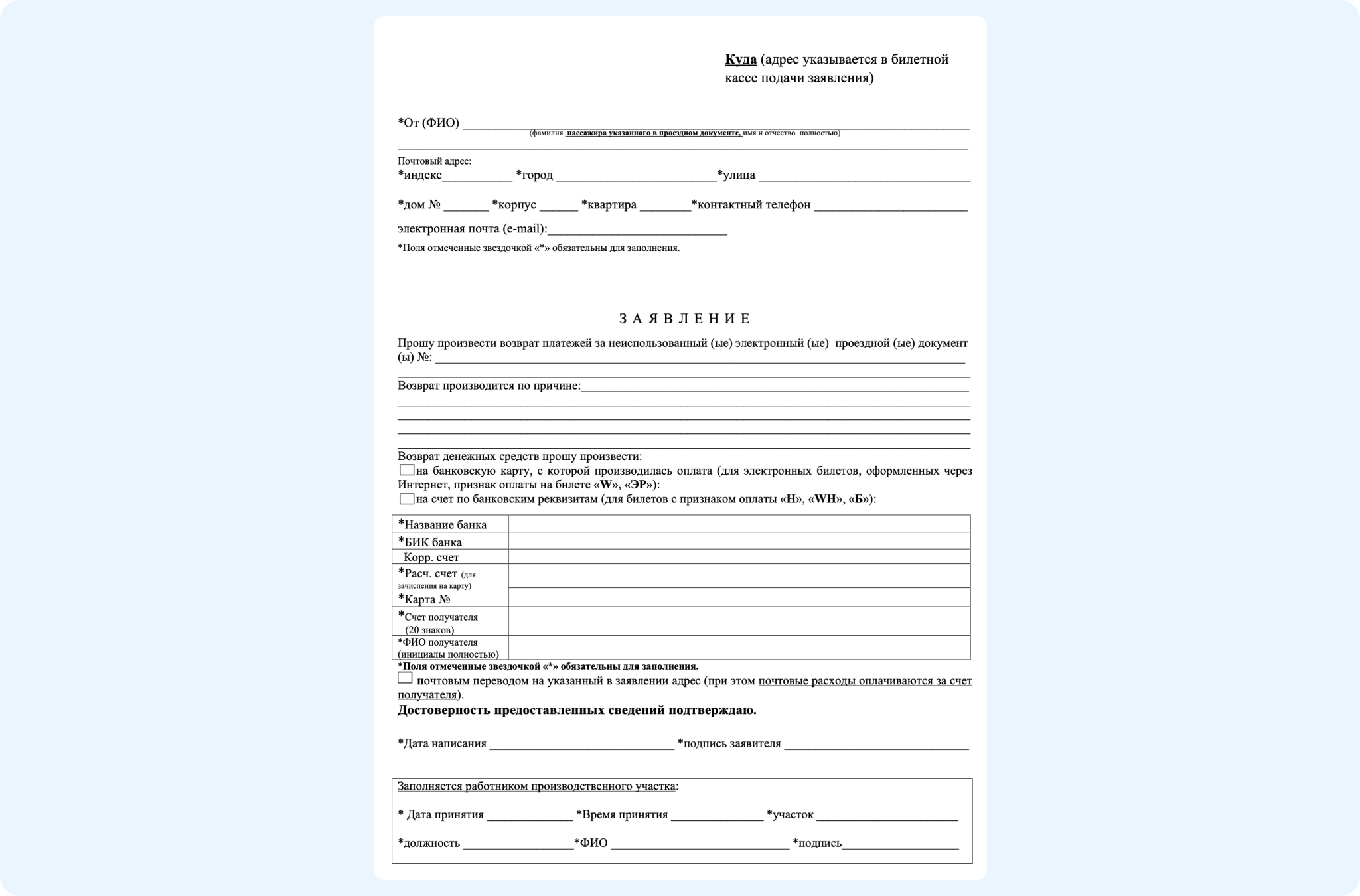 Для оформления возврата необходимо заполнить специальное заявление (бланк можно взять в кассе или заранее скачать на сайте РЖД) и передать его сотруднику вместе со следующими документами: