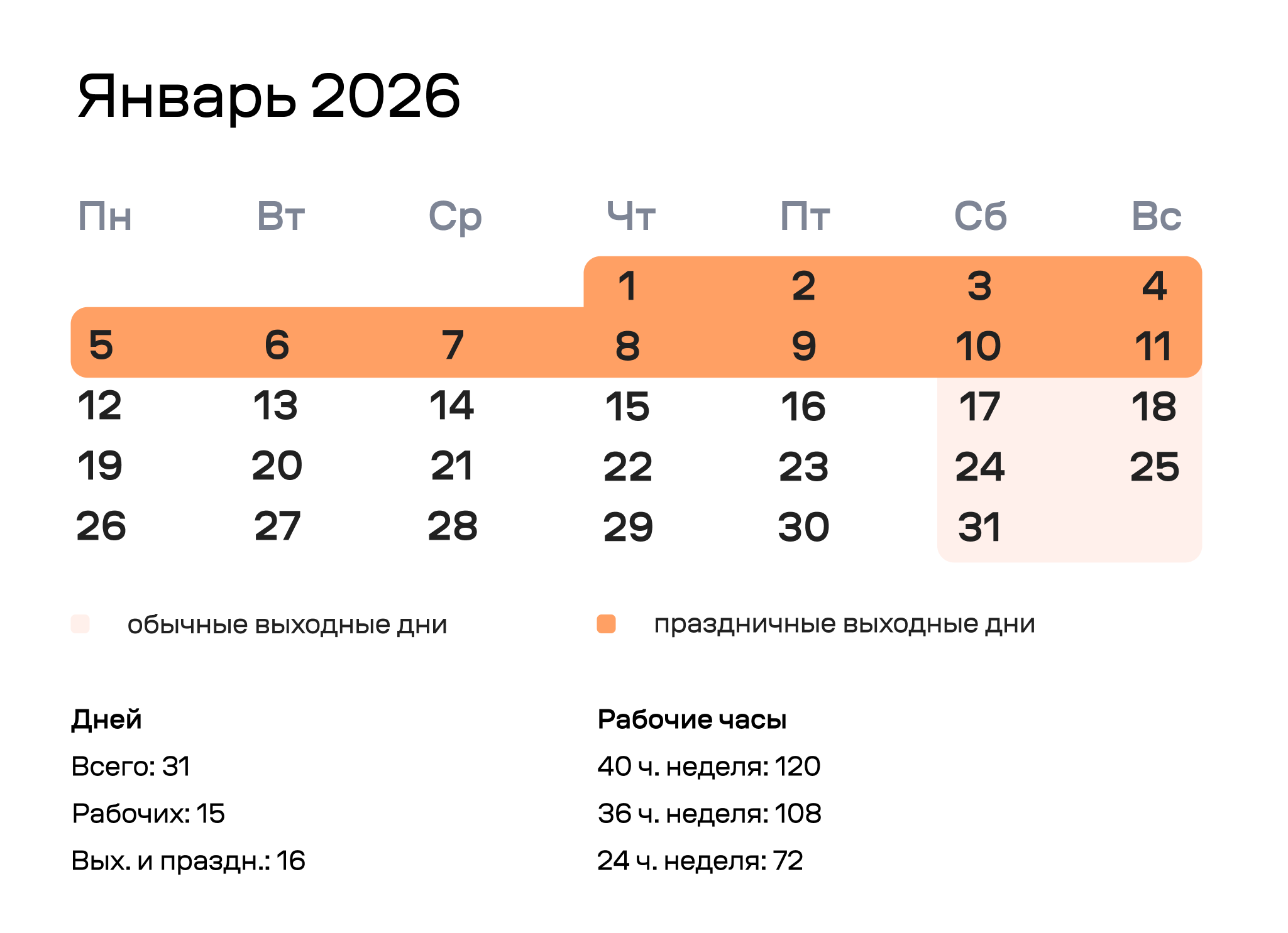 Норма рабочего времени в январе 2026 года зависит от установленной недельной нагрузки. По производственному календарю она составляет: