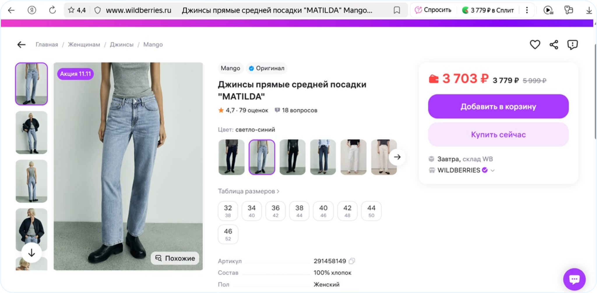 | Джинсы Matilda от Mango | 5999 | 5999 | 3779 (Wildberries) |