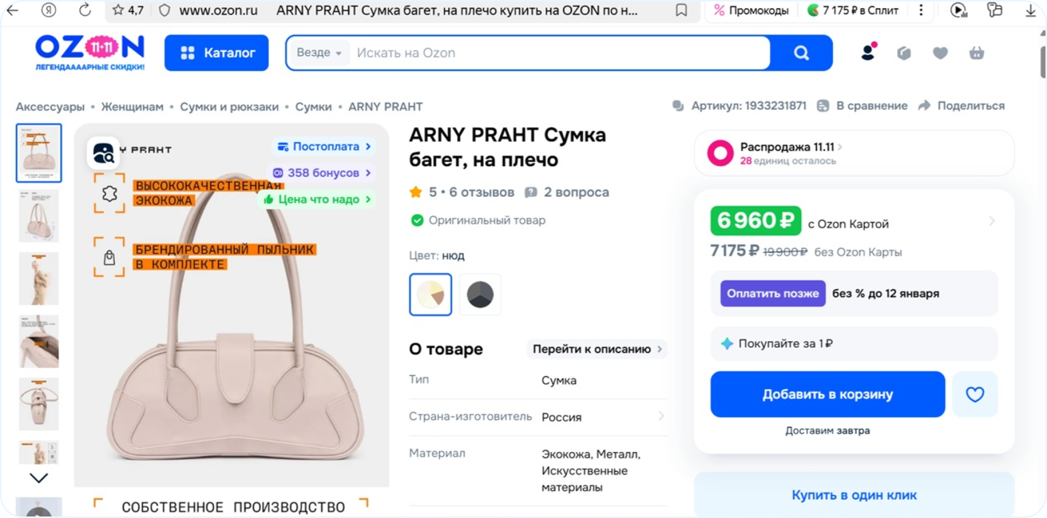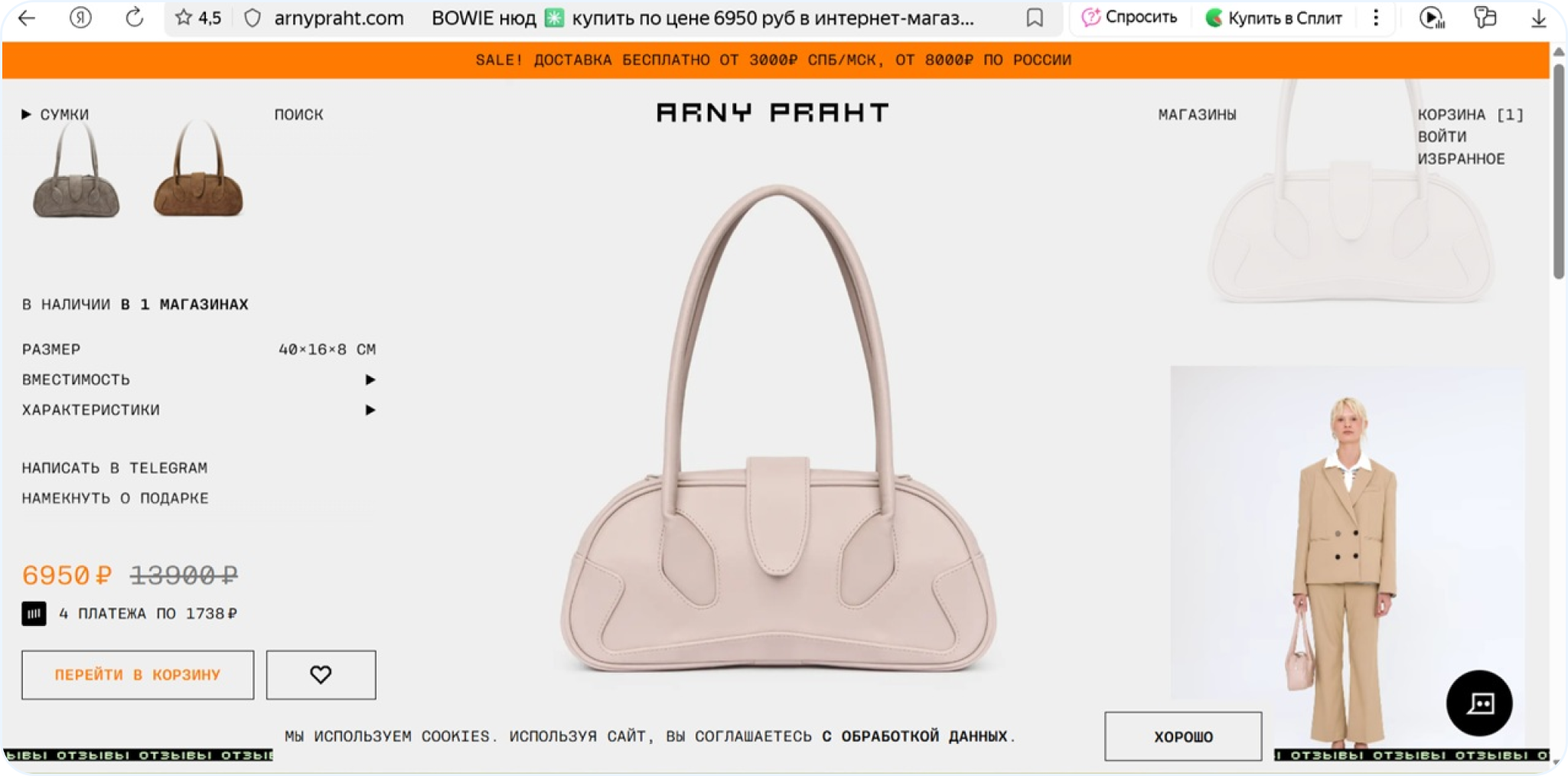 | Сумка-багет BOWIE нюд от Arny Praht | 6950 | 6950 | 7175 (Ozon) |