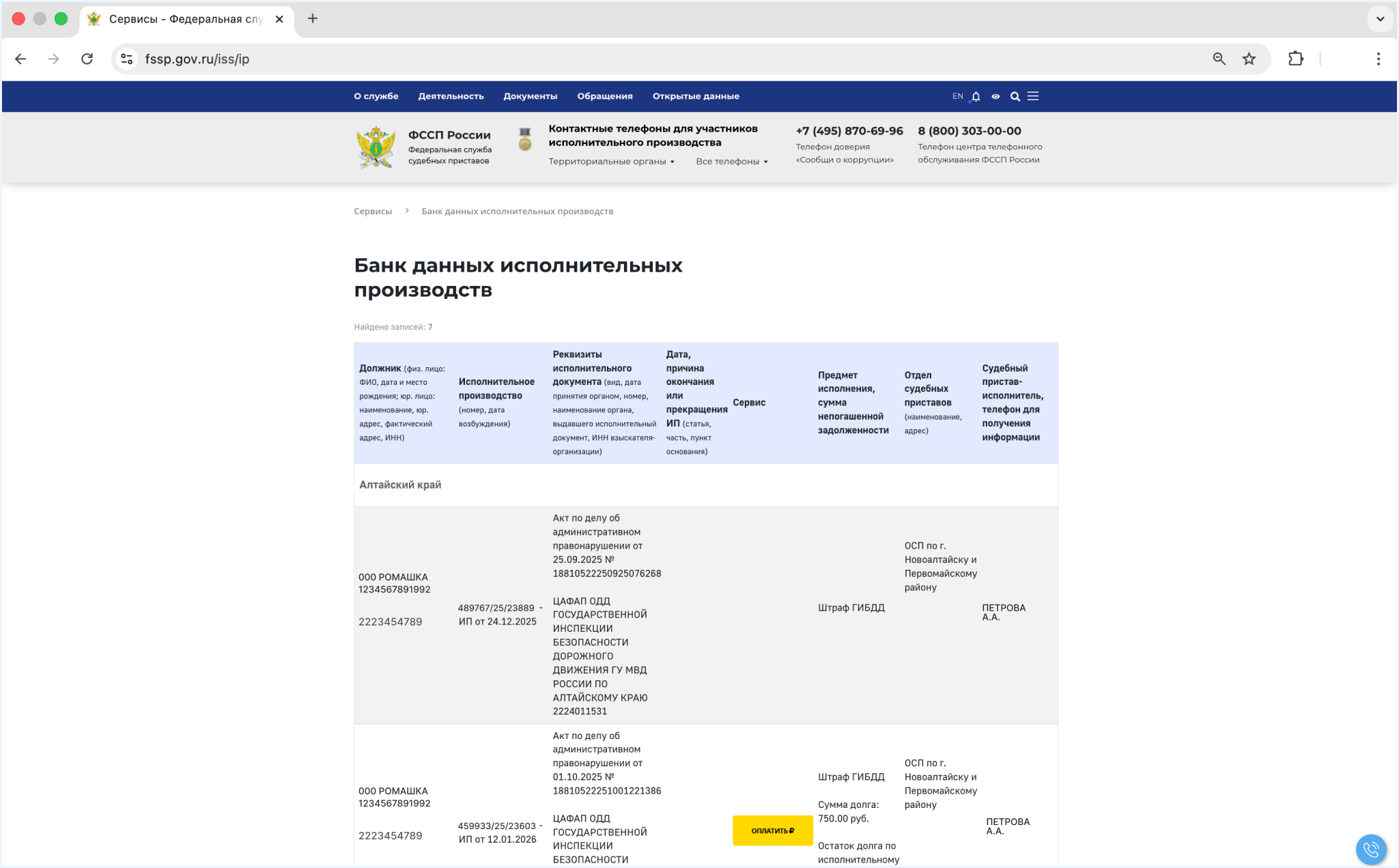 Иногда данные ищут не там. Сведения об исполнительных производствах публикуются только на официальном сайте Федеральной службы судебных приставов и на «Госуслугах». На сторонних сервисах информация может отсутствовать или быть неактуальной.