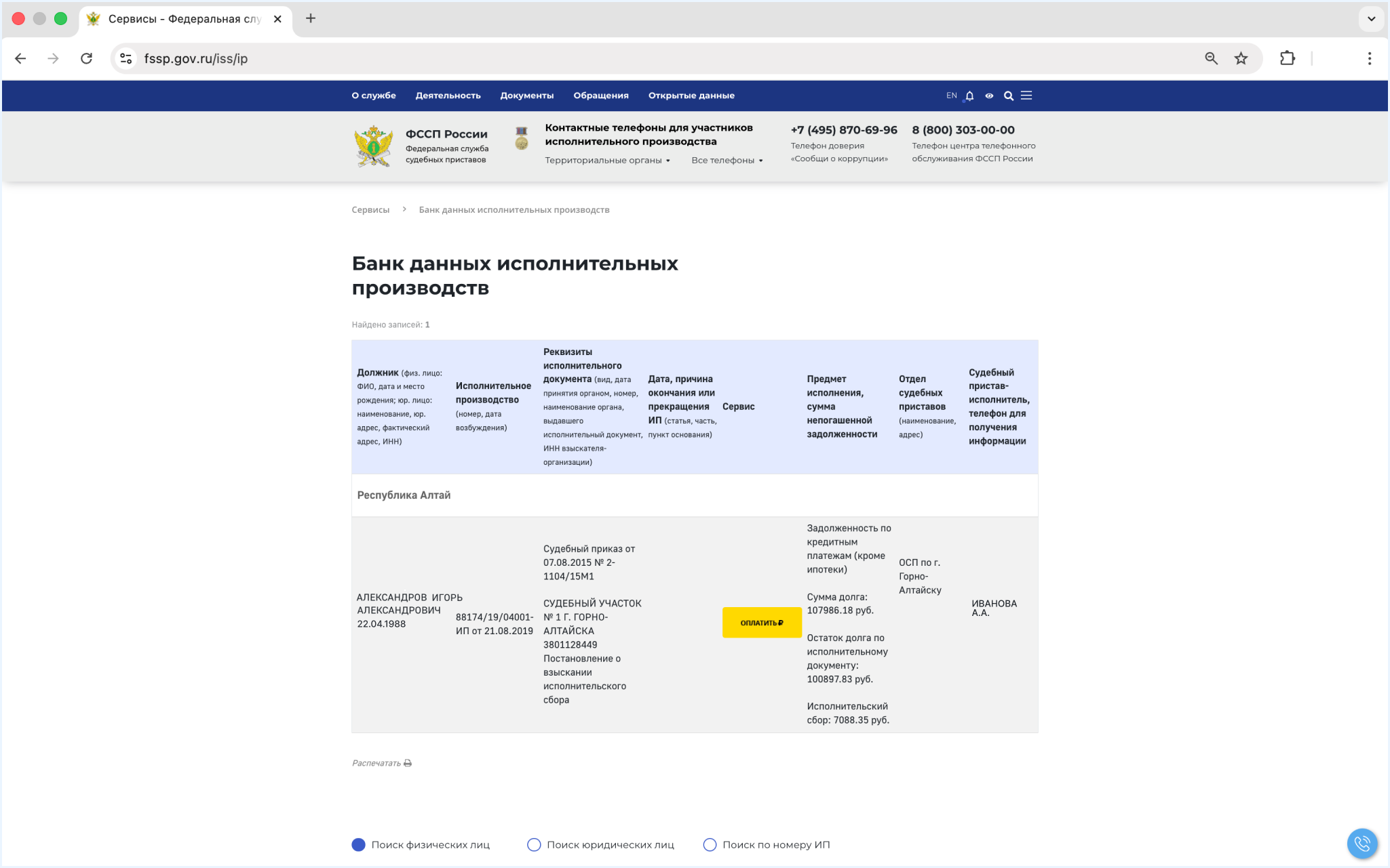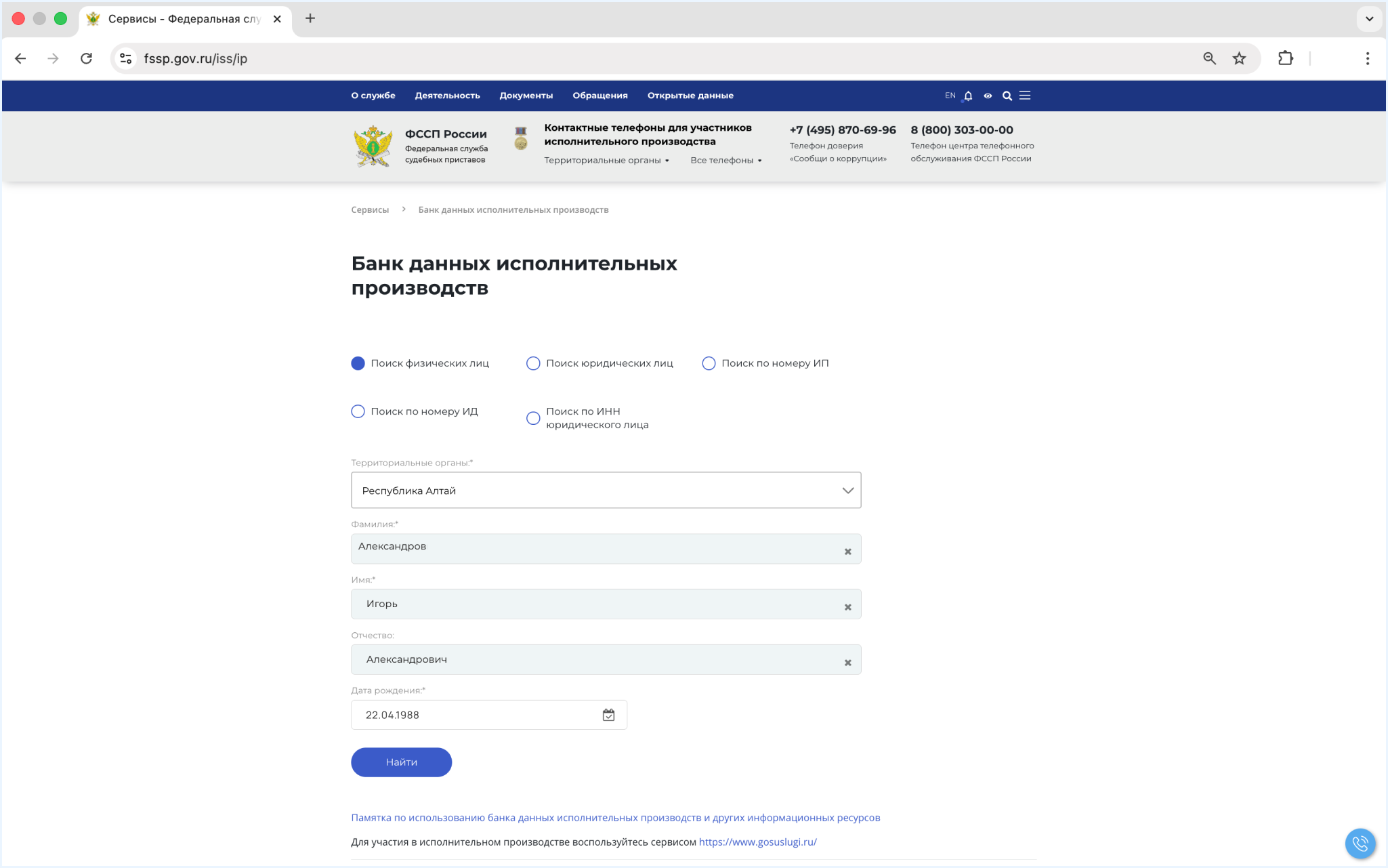 Введите регион поиска, Ф. И. О. и дату рождения человека. Если в отношении него есть исполнительное производство, система высветит данные.