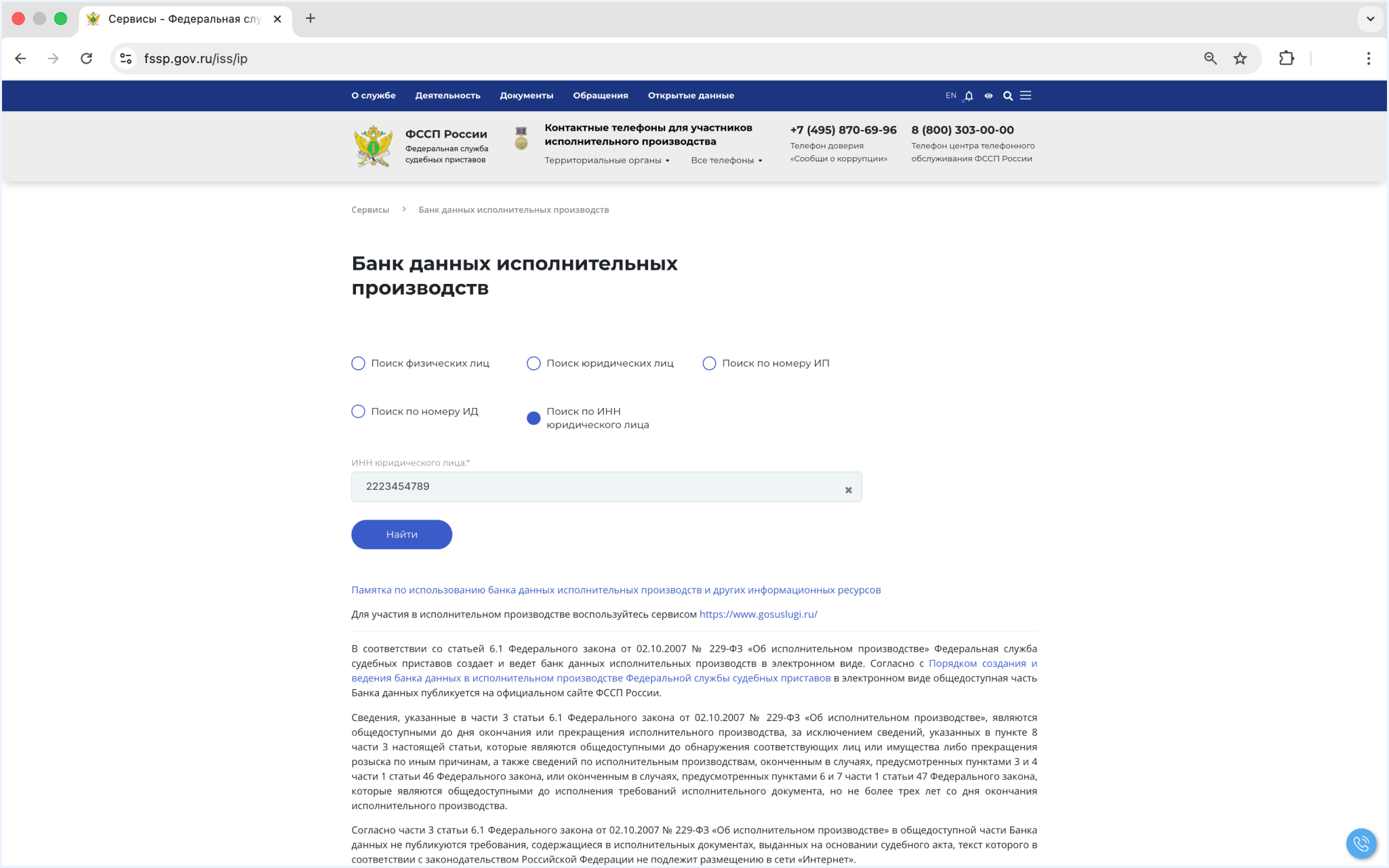 Когда номер ИП уже есть, его можно ввести в строку поиска на главной странице сайта ФССП. Система покажет информацию о задолженности и текущем статусе дела.