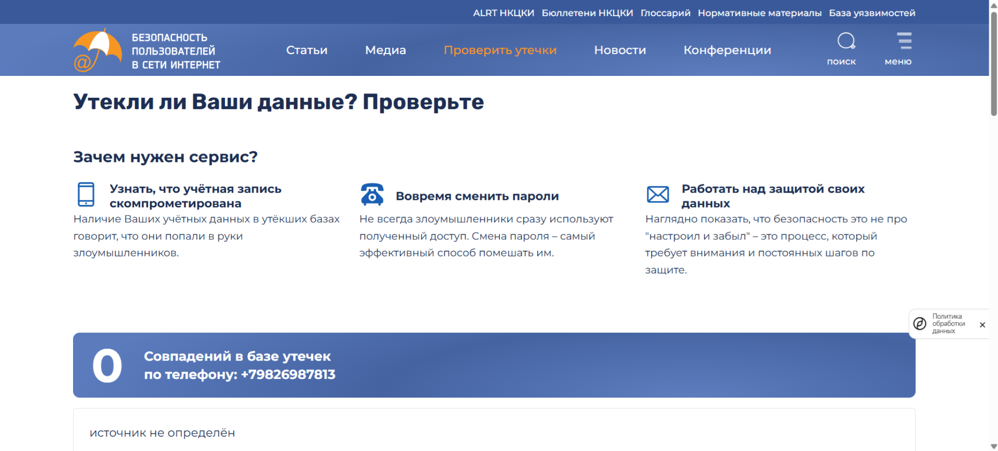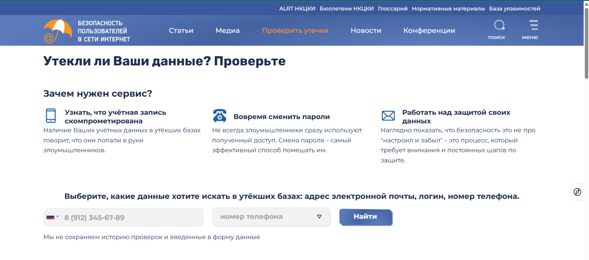 Для проверки утечки в Национальном координационном центре по компьютерным инцидентам создали специальный ресурс, где вы можете узнать, фигурировали ли ваши данные в сливах. Это агрегатор данных об утечках электронной почты, телефона, логина или пароля. Чтобы выяснить, попали ваши данные во всеобщий доступ, введите в поисковой строке интересующую вас информацию — email, номер телефона или логин. И нажмите «Найти».