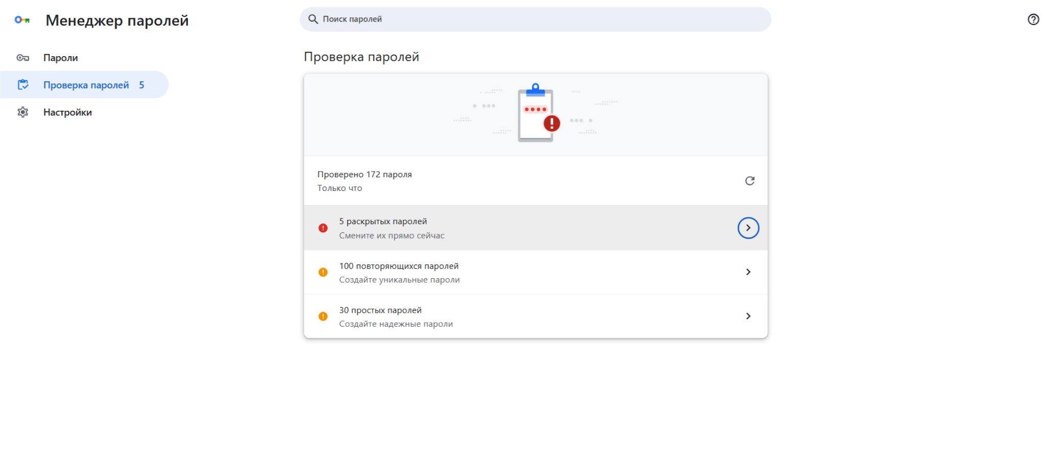 После этого браузер покажет количество «скомпрометированных паролей». В нашем случае их оказалось пять — пришло время их сменить.