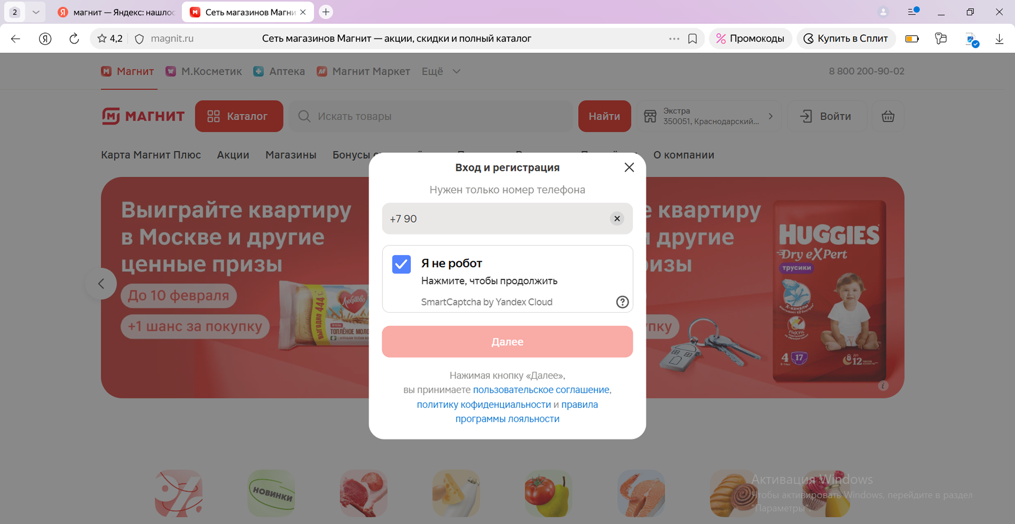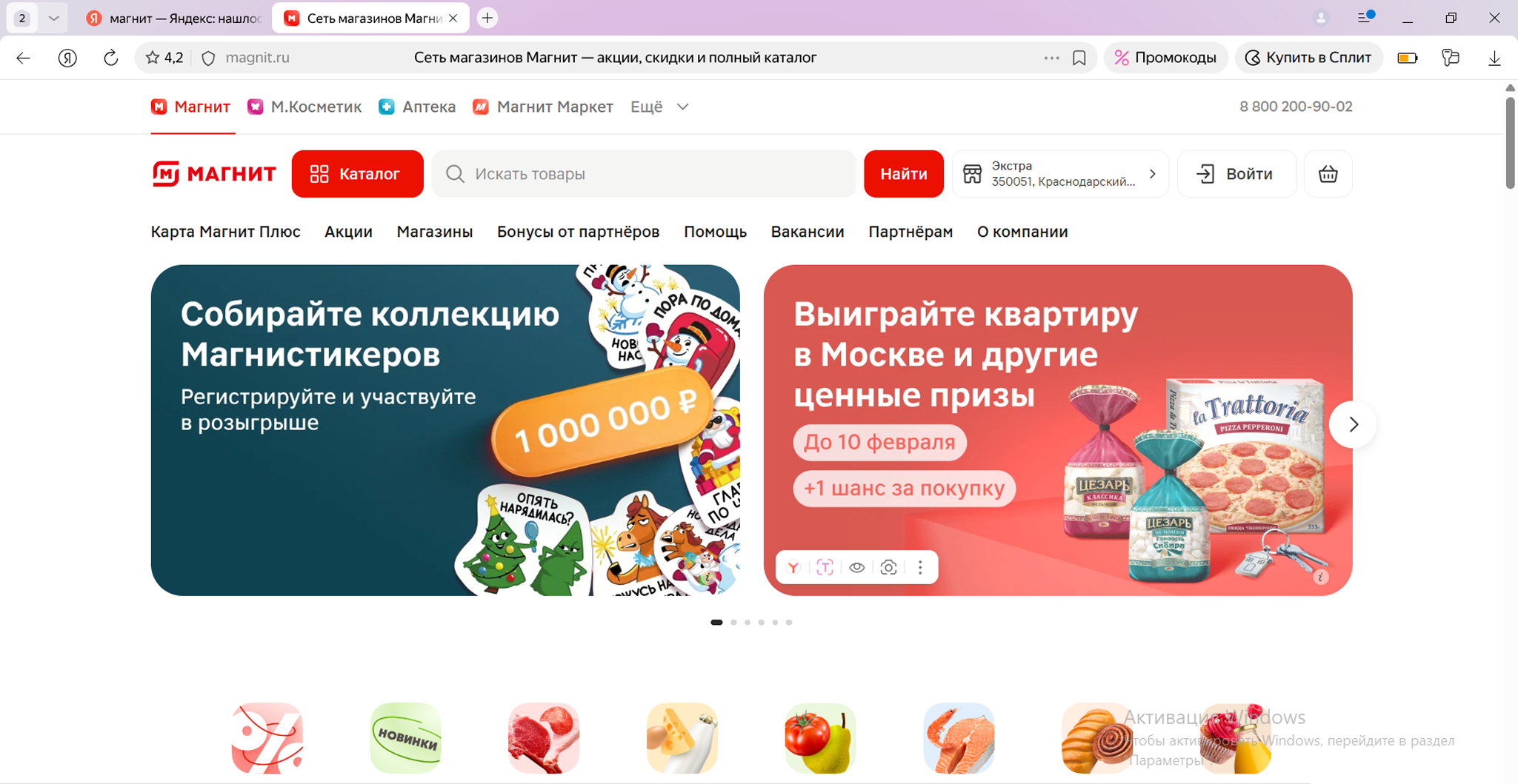 - На главной странице сайта сети «Магнит» нажмите «Войти».