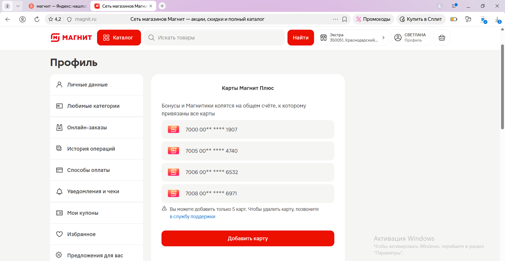 - На открывшейся странице в меню слева нажмите «Карты Магнит Плюс».