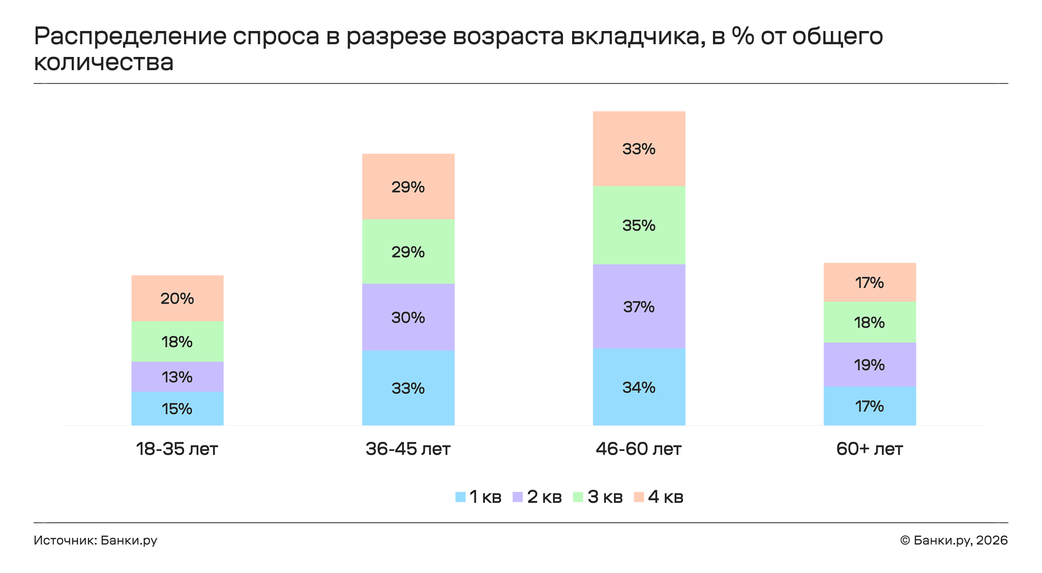 Молодые клиенты в меньшей степени участвуют в размещениях депозитов из-за ограниченных накоплений и большей склонности к потреблению или альтернативным инвестициям. Примечательно то, что к концу года доля молодежи росла: в IV квартале каждый пятый вкладчик был в возрасте от 18 до 35 лет.