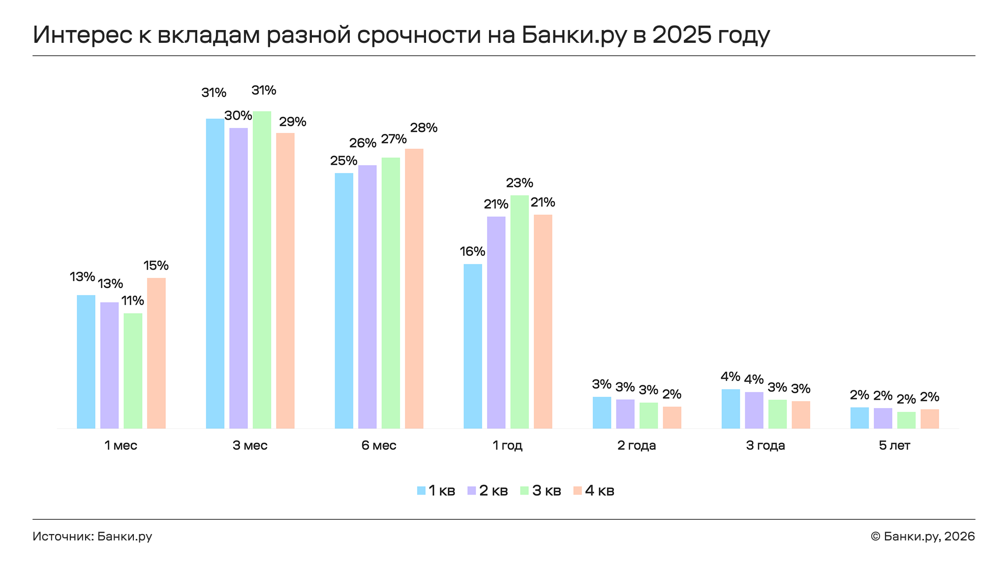 Высокие процентные ставки в первой половине года обеспечивали вкладчикам привлекательную реальную доходность, а во втором полугодии смена монетарного цикла и замедление инфляции усилили стремление зафиксировать наилучшие условия размещения средств, диверсифицируя сроки.