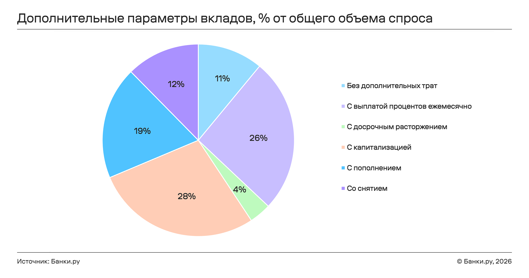 Наибольшим спросом пользовались вклады с капитализацией процентов. Почти треть вкладчиков выбирала именно этот параметр, стремясь увеличить итоговую доходность за счет начисления процентов на проценты. Это говорит о росте финансовой грамотности и понимании эффекта сложного процента даже в консервативных инструментах.
