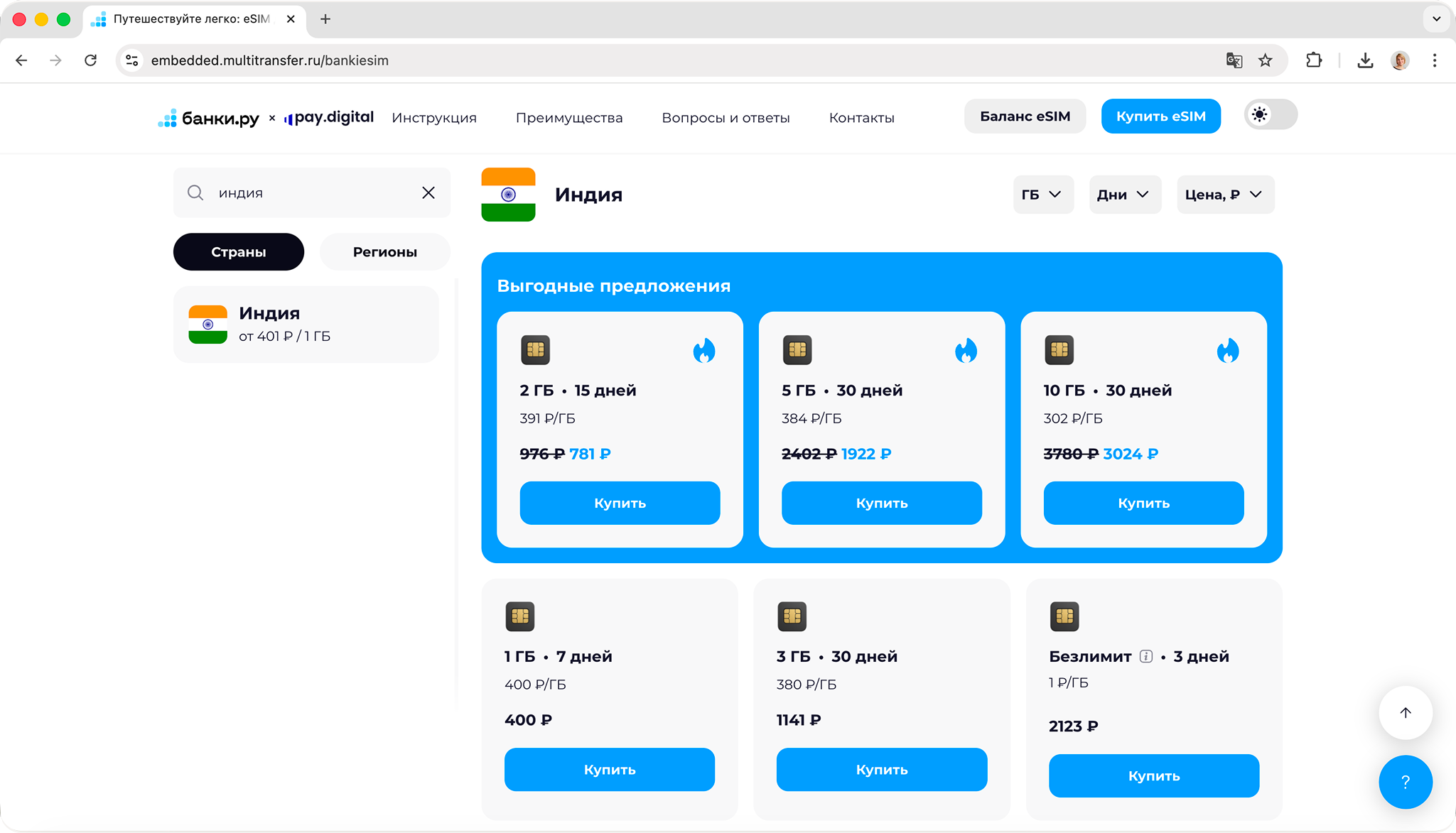 Выбор eSIM достаточно большой. Есть eSIM для Индии у Банки.ру: