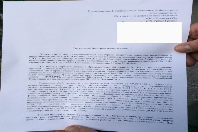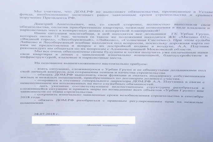 Около тысячи дольщиков Urban Group подали как коллективные, так и личные письма президенту России Владимиру Путину, председателю правительства Дмитрию Медведеву и в Росимущество. Акция состоялась утром 28 июля. В письмах дольщики жалуются на бездействие «ДОМ.РФ» и требуют от правительства решительных мер.