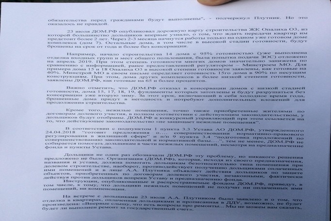 По мнению дольщиков, «ДОМ.РФ» не выполняет обязательства, прописанные в уставе фонда, необоснованно затягивает ранее заявленные сроки строительства и срывает поручение президента.