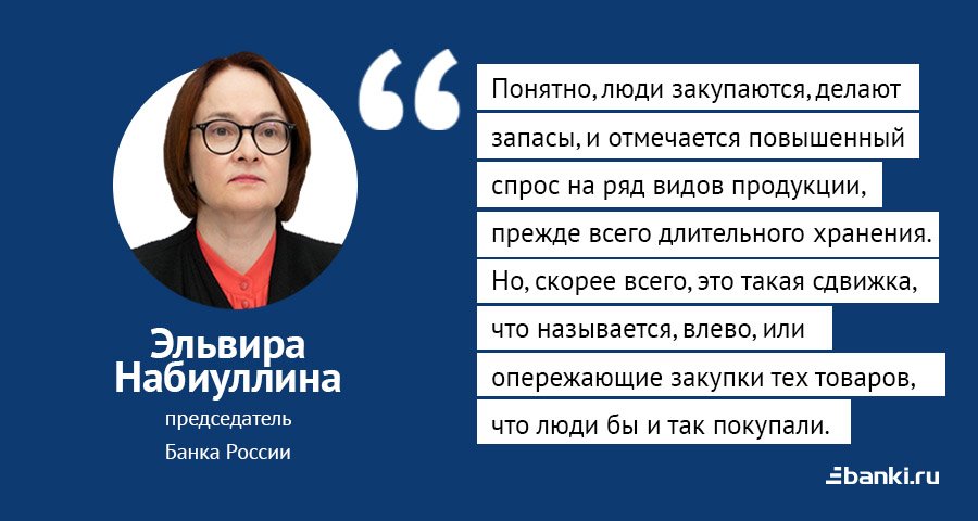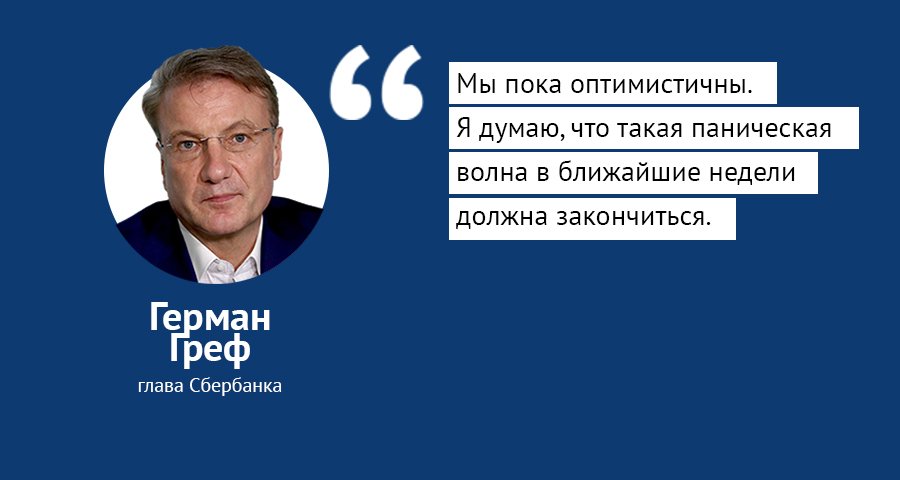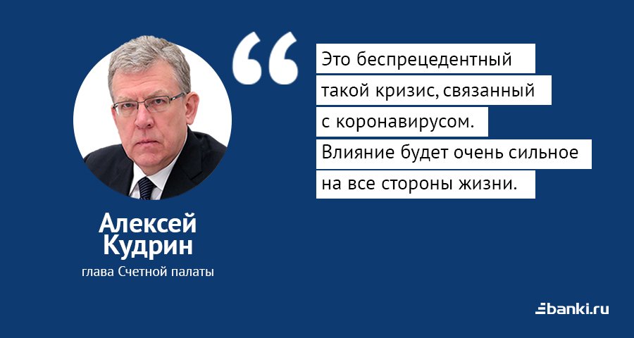 • Центробанк на этой неделе также признал, что на данный момент невозможно точно определить всю глубину влияния коронавируса и волатильности на рынках на экономику России. В Сбербанке наихудшим вариантом развития событий считают доллар по 100 рублей и снижение цен на нефть до 20 долларов за баррель. Аналитики «Эксперт РА» полагают, что развитие банковского сектора в 2020 году может пойти по умеренно негативному или кризисному сценарию. По их прогнозу, отрасль может столкнуться с падением прибыли не менее чем на 20%, а ключевая ставка повысится до 7—7,5%. При этом Fitch назвало ограниченным влияние снижения курса рубля на прибыль российских банков. Глава Счетной палаты РФ Алексей Кудрин считает, что кризис, вызванный коронавирусом, будет беспрецедентным и затронет все стороны жизни. Первый зампред ВТБ Юрий Соловьев констатировал «совершенный шторм» в экономике, а глава Сбербанка Герман Греф назвал кризис возможностью стать сильнее.