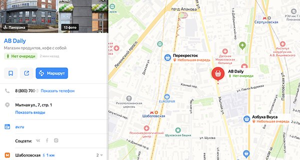 Увидеть размер очереди можно в веб-версии «Яндекс.Карт». Рядом с названием организации видно оценку: нет очереди, небольшая, большая. Скоро эта возможность появится в мобильном приложении «Карт» и в «Яндекс.Навигаторе». Сейчас к проекту подключены 169 супермаркетов «Азбука вкуса» и 55 магазинов «Перекресток» в Москве и Санкт-Петербурге.