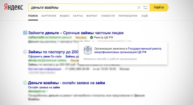 Банк России приступил к реализации проекта по маркированию в поисковой выдаче системы «Яндекс» сайтов микрофинансовых организаций, сведения о которых содержатся одновременно в государственном реестре МФО и в реестре одной из трех действующих саморегулируемых организаций в сфере финансового рынка. Об этом сообщается на сайте регулятора.