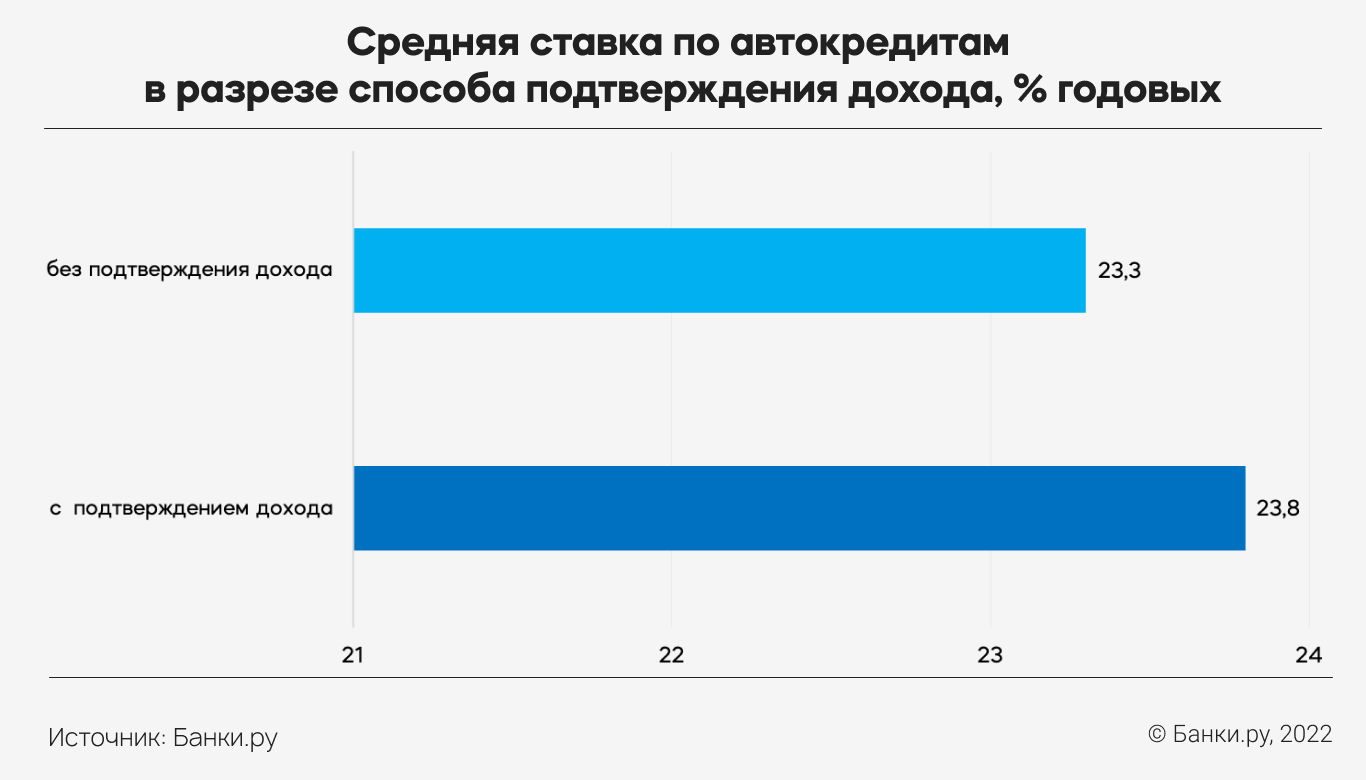 В частности, средняя ставка при оформлении автокредита по полному пакету документов составила 23,8% годовых, а без подтверждения дохода — 23,3% годовых. Сниженная ставка при кредитовании по двум документам связана с тем, что такую опцию предоставляли заемщикам 11 банков из анализируемого нами пула, в то время как полный пакет документов для оформления этого продукта требовали 9 игроков.