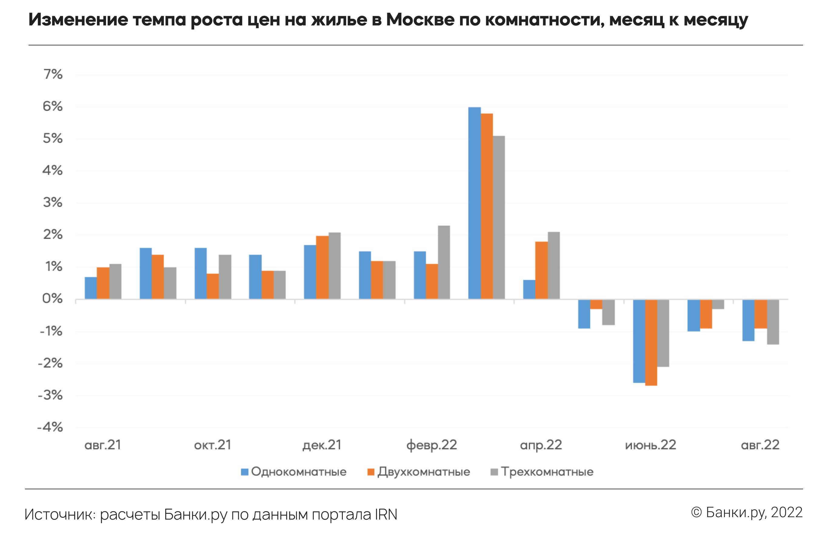 В июне снижение цен на московские квартиры ускорилось до 2,2% (до 264,3 тыс. рублей), а в Подмосковье цены упали на 1,3% (до 153,5 тыс. рублей). Снижение цен фиксировалось, даже несмотря на возвращение процентной ставки по льготной ипотеке до прежних уровней. Лишь в июле отрицательные темпы роста несколько притормозили: в Москве вторичное жилье подешевело на 0,7% (до 262,5 тыс. рублей), в Подмосковье также на 0,7% (до 152,4 тыс. рублей). Однако замедление оказалось временным, и уже в августе цены вновь ускорили снижение. В результате в целом за май — август стоимость московских квартир в среднем снизилась на 4,5%, при этом агентство IRN отмечало, что цены реальных сделок сократились еще существенней.