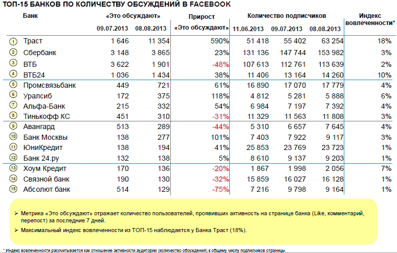 количество подписчиков банка «Траст» увеличилось на 14% в Facebook*.