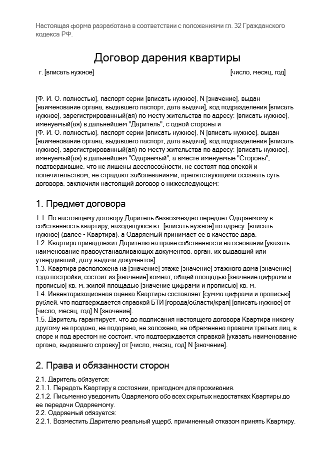 Заполнение начинают с данных сторон: фамилии, имени, отчества, паспортных реквизитов, адреса регистрации и других сведений, которые позволяют точно определить дарителя и одаряемого. Затем подробно описывают предмет договора — что именно передается в дар. Для денег указывают сумму, для автомобиля — основные идентификационные данные, для недвижимости — адрес, площадь, кадастровый номер и иные характеристики объекта. Именно предмет должен быть описан максимально точно, потому что без него договор считается несогласованным.