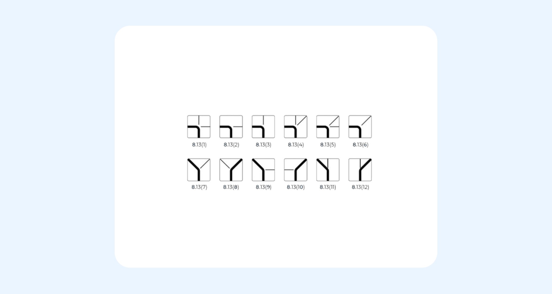 Если на главной дороге меняется направление или разветвление сложное (например, «развилка» с несколькими направлениями), под знаком 2.1 добавляют табличку с черными линиями (табличка 8.13 по ПДД), где жирная линия обозначает главную дорогу, а тонкие — второстепенные. На подобных схемах направление главной выделено и подсказывает водителю, по какой траектории сохраняется приоритет.