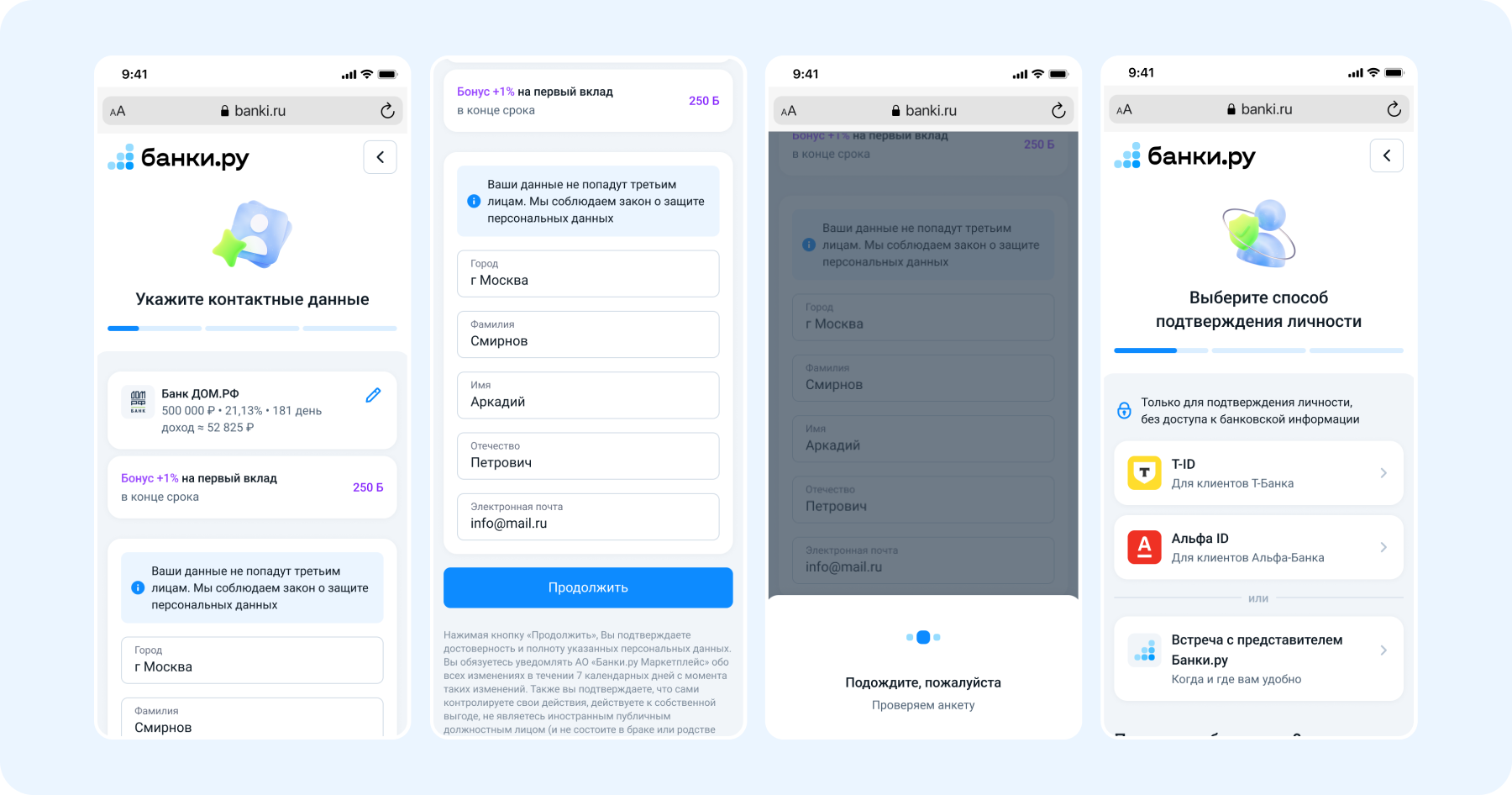 Это можно сделать онлайн (через ID Т-Банка и Альфа-Банка) или на встрече с представителем Банки.ру. Подтверждение личности нужно, чтобы банк, в котором вы открываете вклад, убедился, что это делаете именно вы. После подтверждения личности выбранный вклад появится в вашем личном кабинете.