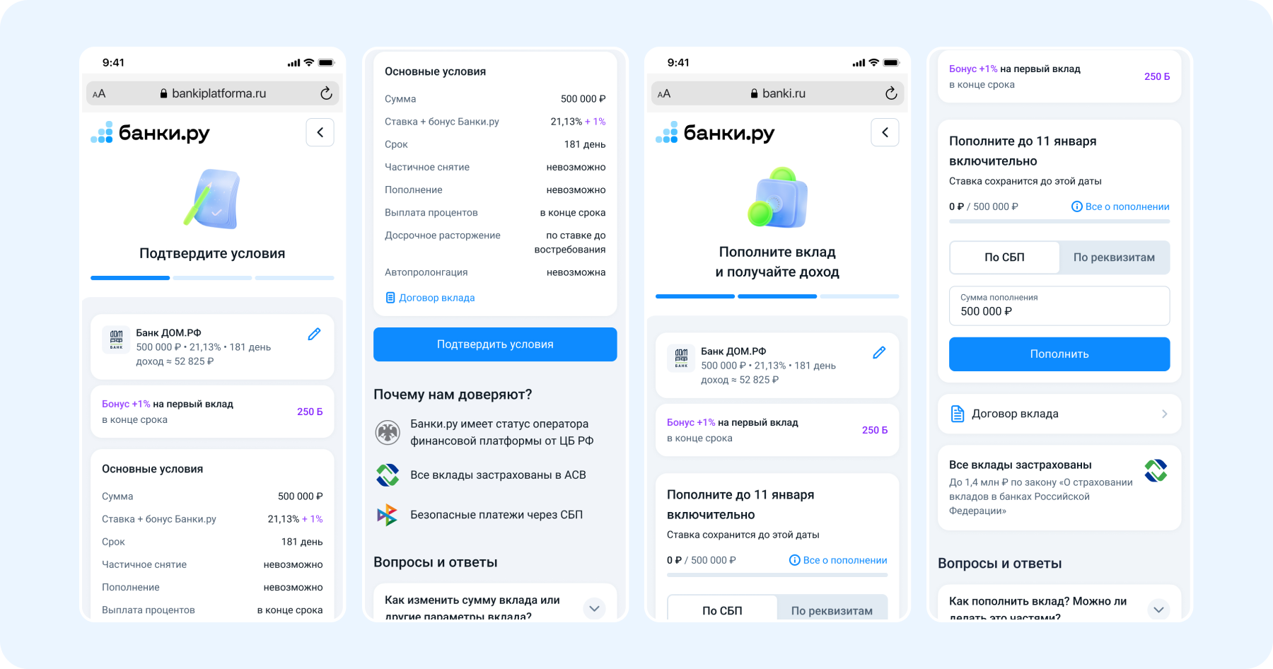Когда вы подтвердите условия по вкладу, банк фиксирует ставку по нему на указанный в личном кабинете срок. Условия по вкладу фиксируются при подписании договора. Для завершения процесса открытия вклада остается пополнить счет.