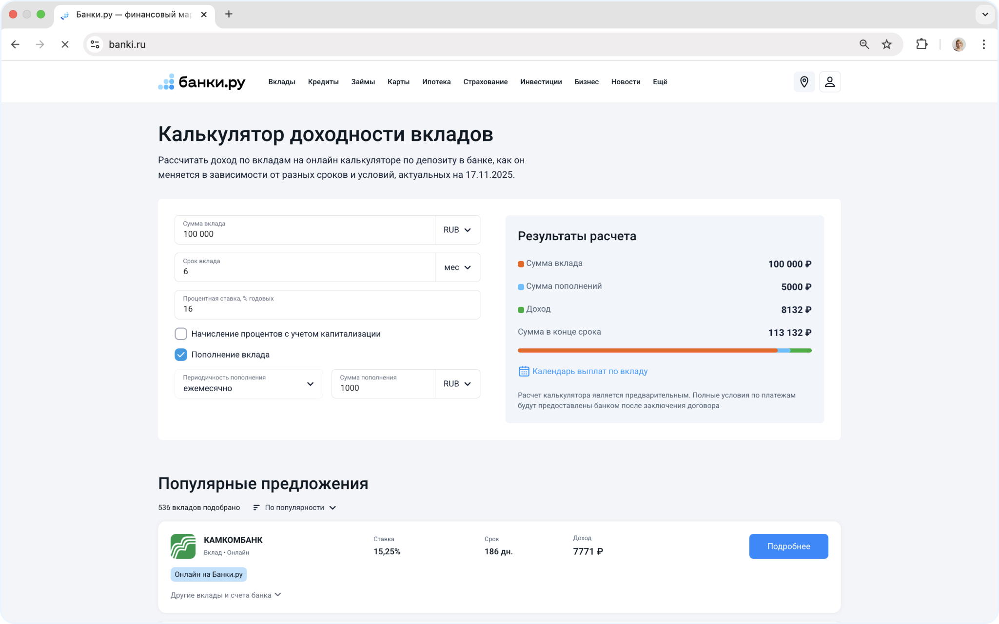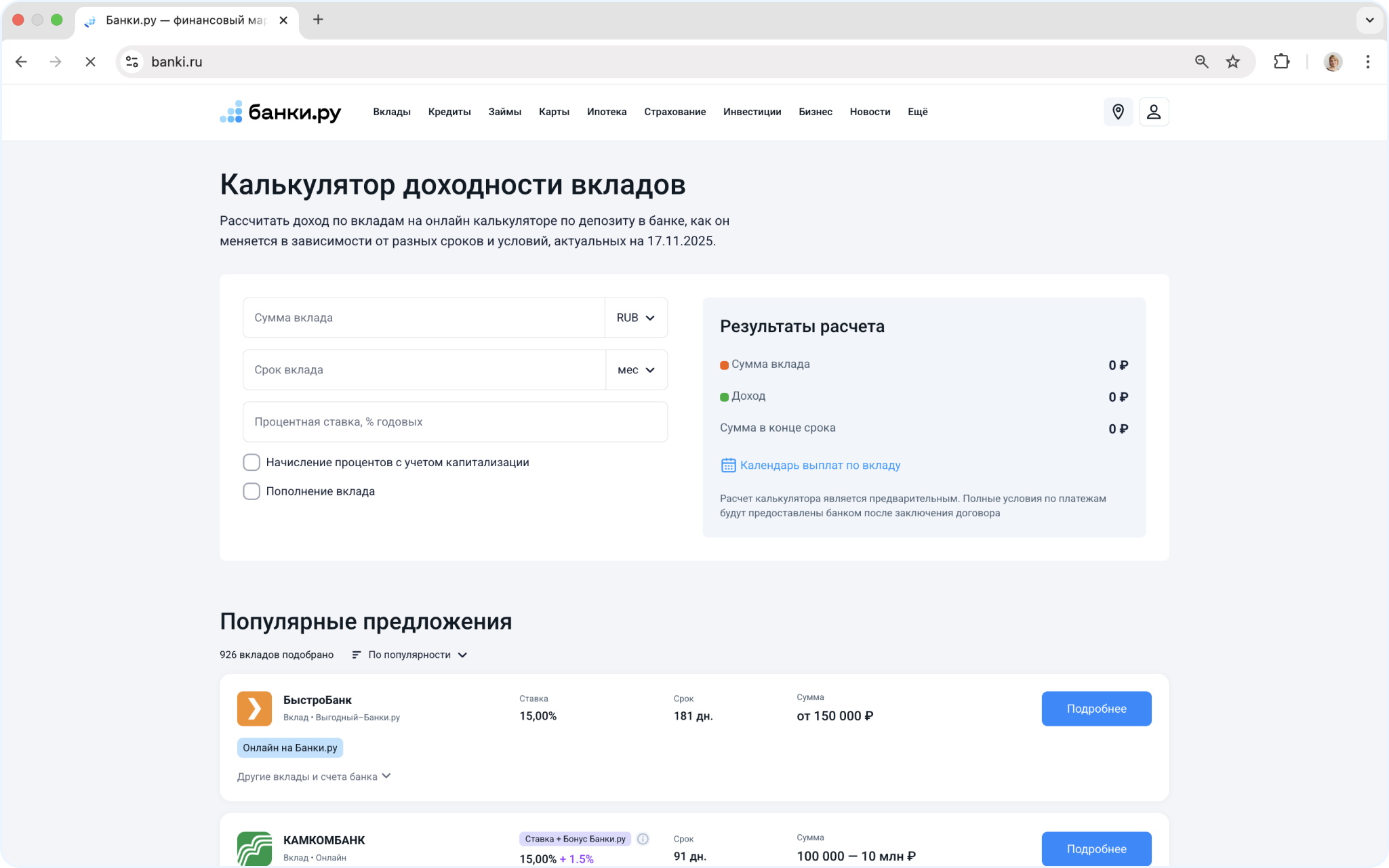 Калькулятор вкладов на Банки.ру помогает рассчитать ориентировочную доходность депозита с учетом всех условий — суммы, срока, ставки, капитализации и пополнений.