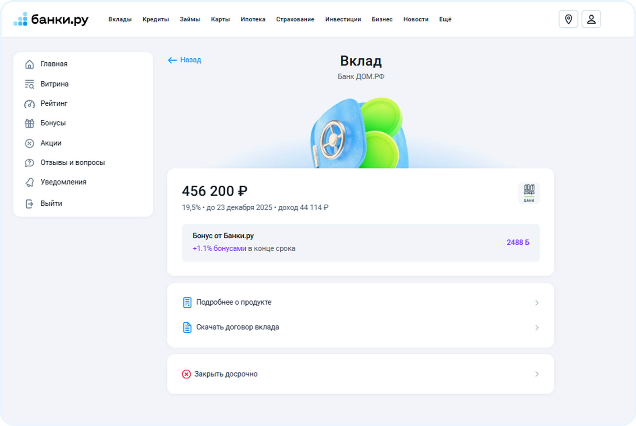 Обратите внимание, при досрочном закрытии вклада доход по нему рассчитывается по ставке до востребования. Точные условия досрочного закрытия вклада можно найти в вашем договоре с банком.