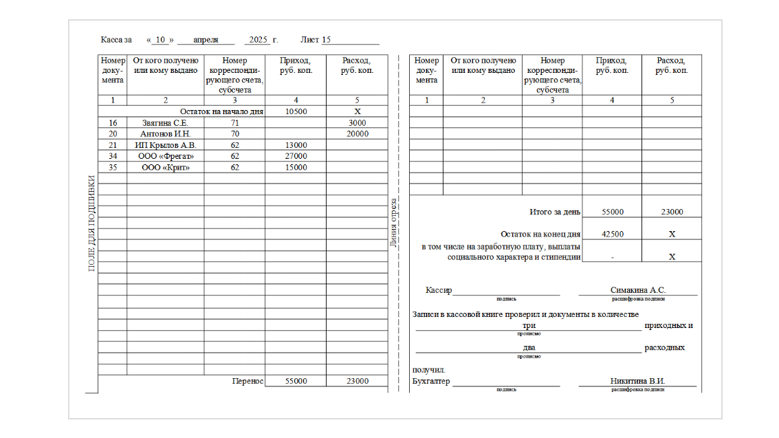 4. В конце дня кассир должен сверить данные кассовой книги с данными расходного и приходного кассовых ордеров. Важно подвести итоги операций за день и определить остаток на конец дня.