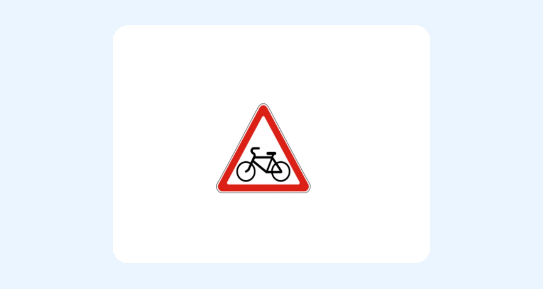 На этом предупреждающем знаке дорожного движения на белом фоне с красной рамкой изображен велосипед, что подразумевает пересечение дороги с велодорожкой вне перекрестка. Такой знак предоставляет преимущество автомобилю, однако призывает быть внимательными всех участников дорожного движения — есть вероятность появления нарушителей: водителей мопедов, недобросовестных велосипедистов, людей. Устанавливаются в населенных пунктах — за 50–100 м, вне — за 150–300 м до места пересечения с велодорожкой.