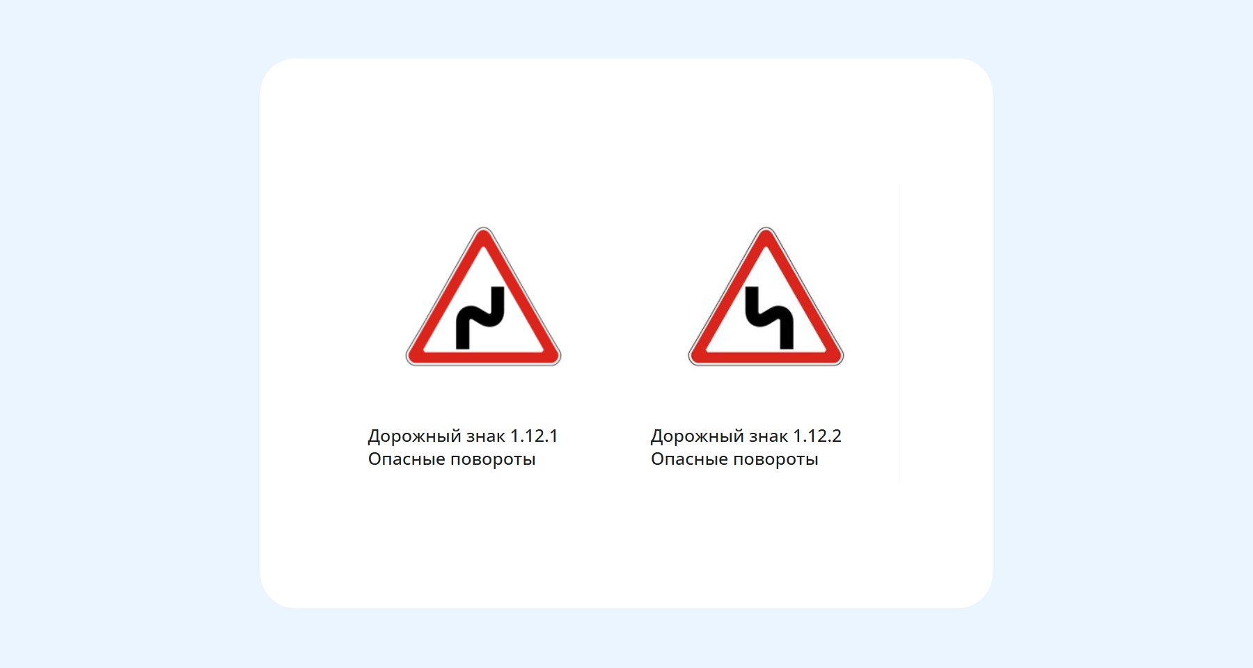 Следующие знаки предупреждения тоже группируем, поскольку они схожи по значению, отличаются лишь рисунком — это черные зигзаги с разным направлением. Они рассказывают о предстоящей серии опасных поворотов, указывая, в какую сторону вильнет дорога в самом начале — вправо или влево.