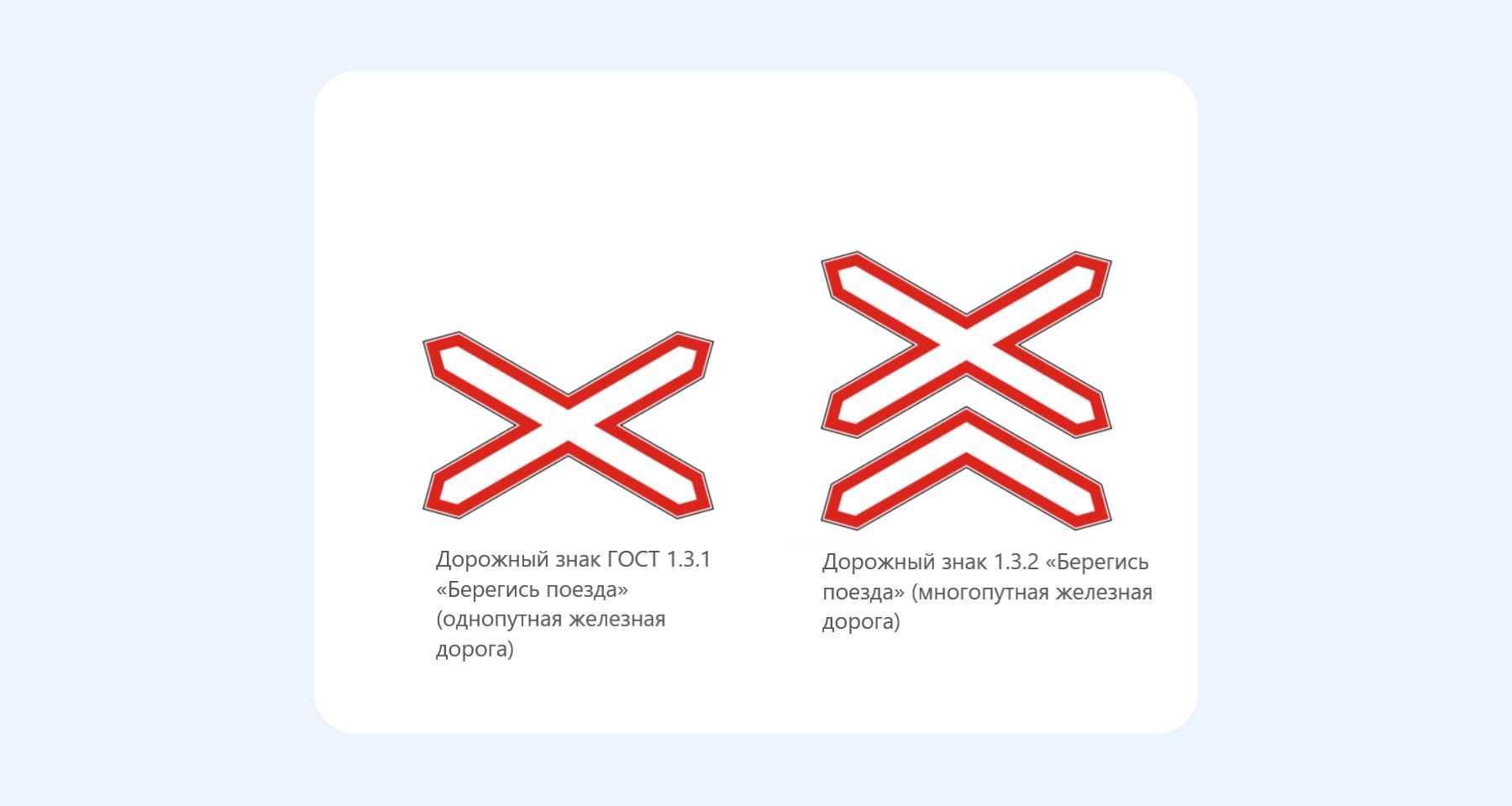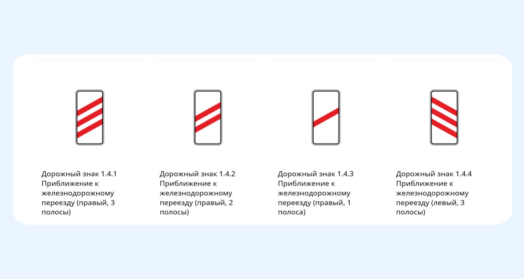 Железнодорожный переезд — опасный участок дороги. Об этом предупредят знаки 1.1 и 1.2. Чтобы лучше сориентироваться и понять, как скоро на пути появится ж/д переезд, устанавливают дополнительные таблички — 1.4 «Приближение к железнодорожному переезду».