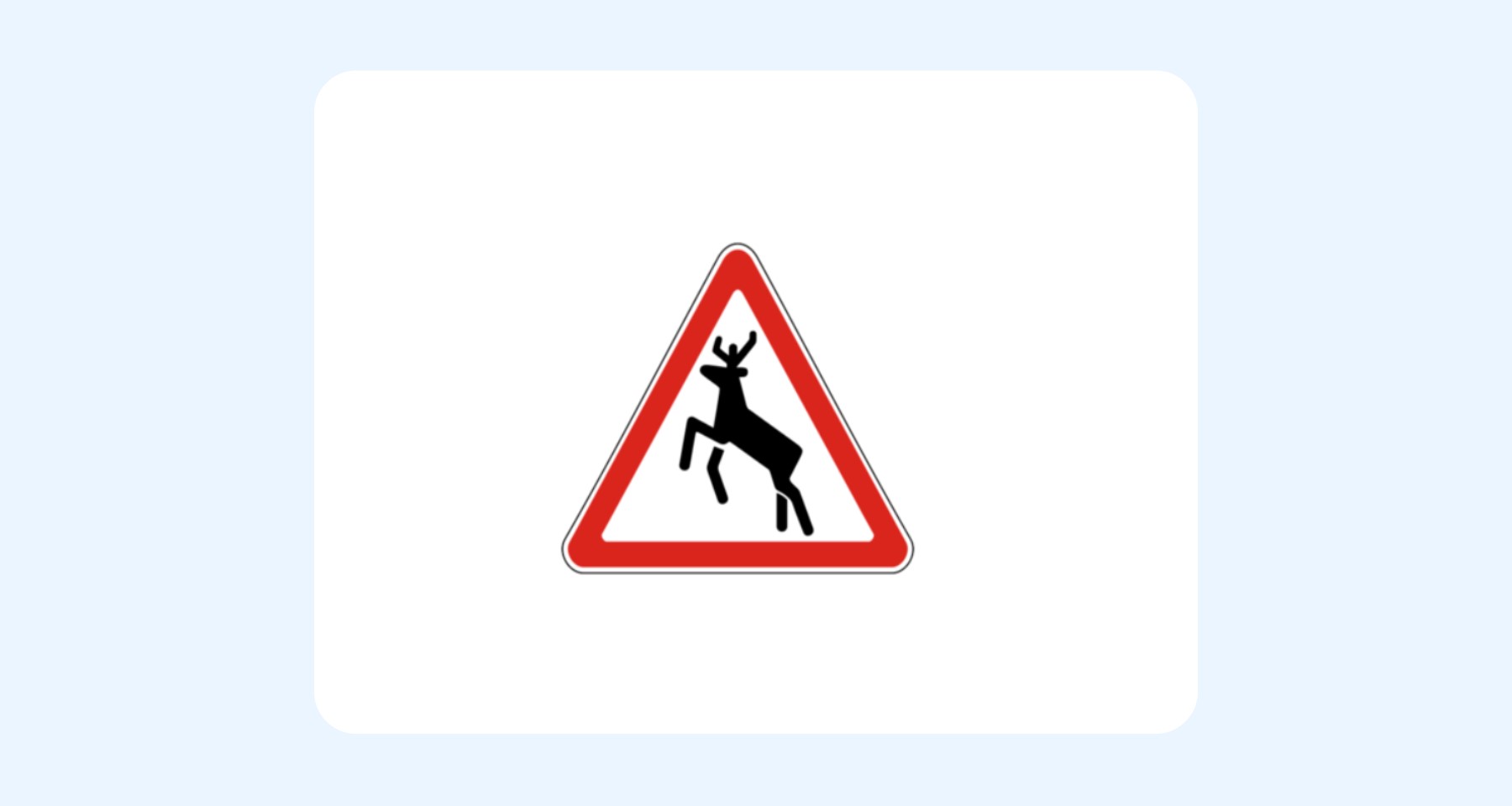 На знаке предупреждения «Дикие животные» изображен черный олень. Табличка с таким рисунком сообщает: возможно внезапное появление диких животных на дороге, что не исключает столкновения с ними.