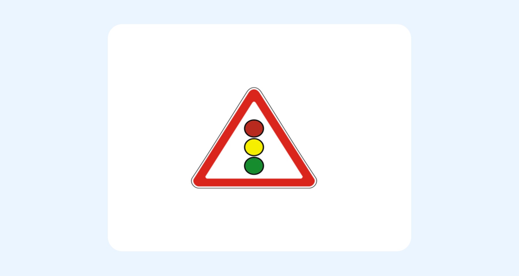 О приближении к дороге, на которой установлен светофор, водителю подскажет знак 1.8 «Светофорное регулирование». Треугольное полотно, белый фон, красный кант, в середине — три цветных круга: красный, желтый, зеленый. Интуитивно понятный знак — скоро светофор.