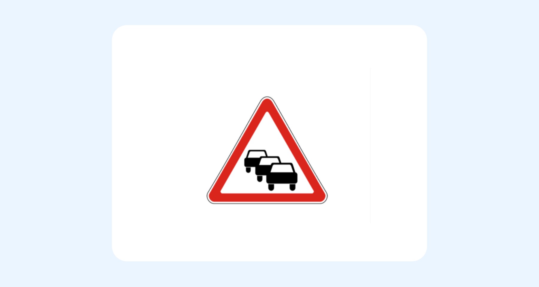 Три черных машины друг за другом в белом треугольнике с красным кантом — еще один предупреждающий знак, 1.32, который говорит человеку за рулем, что впереди образовался затор.