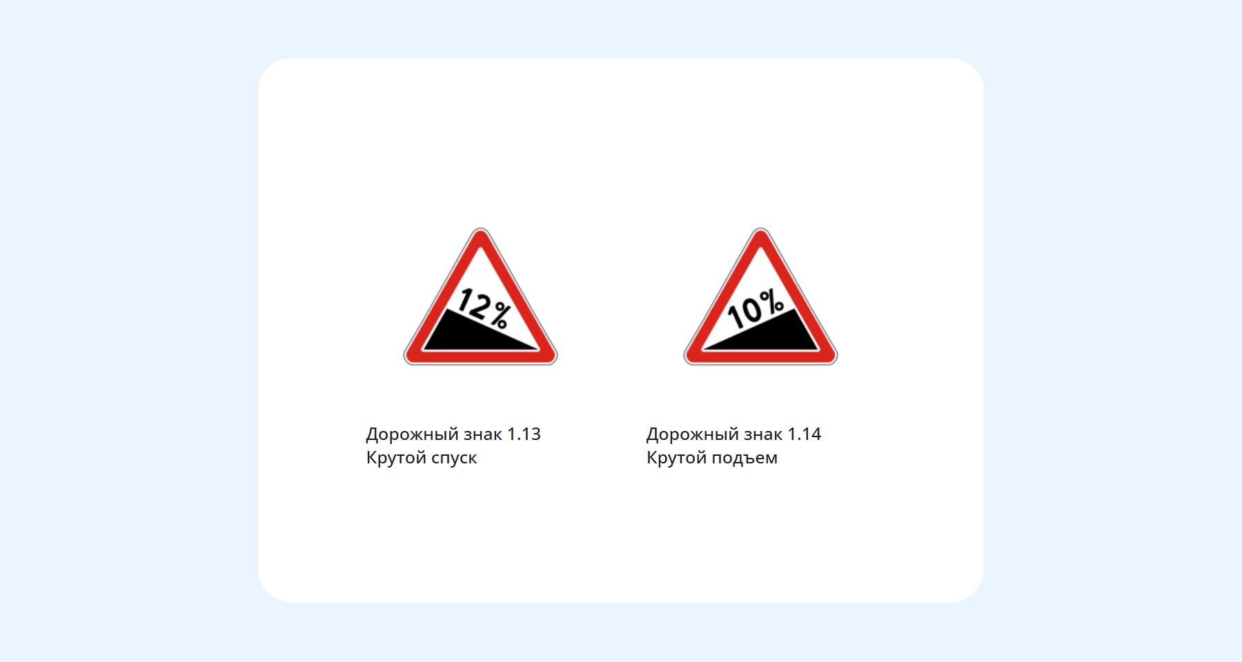 О крутых спуске и подъеме водителя предупредят знаки 1.13 и 1.14, они же обозначают крутизну уклона. Это стандартные по форме предупреждающие знаки. На них схематично изображены наклон дороги, величина спуска или подъема в процентах.