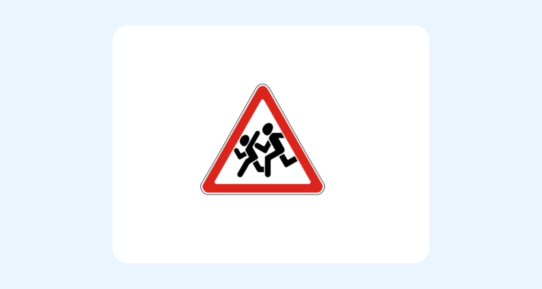 Знак, где нарисованы два бегущих влево человечка разного размера, сигнализирует, что на дороге могут появиться дети. Водитель, приготовься уступить дорогу или немедленно остановиться, ведь где-то рядом находится школа, детский сад или иное детское учреждение.