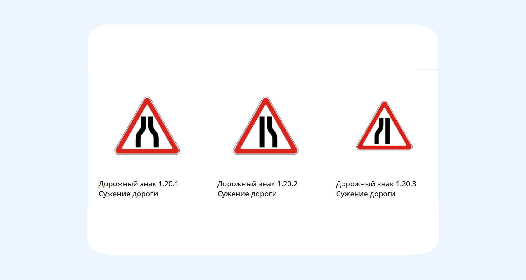 «Сужение дороги с обеих сторон» — знак 1.20.1, «Сужение дороги справа» — знак 1.20.2 и «Сужение дороги слева» — знак 1.20.3: три знака, на которых схематично изображен дальнейший участок дороги. Это значит, что вскоре водителю следует перестроиться на соседнюю полосу, не создавая помех транспорту, который движется по ней.
