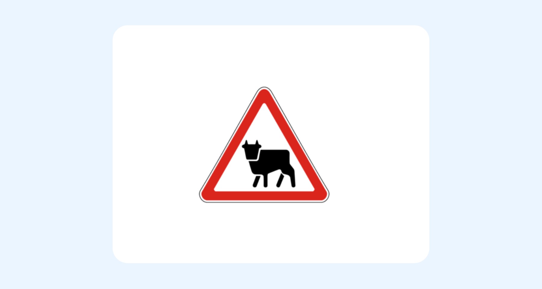 Черная фигура коровы на треугольнике с красной каймой — это знак 1.26 «Перегон скота». Его назначение — предупредить водителя о вероятности появления на дороге домашних животных: коров, лошадей, овец и т. д. Такие знаки характерны для сельской местности и устанавливаются в местах перегона скота, вблизи ферм и пастбищ.