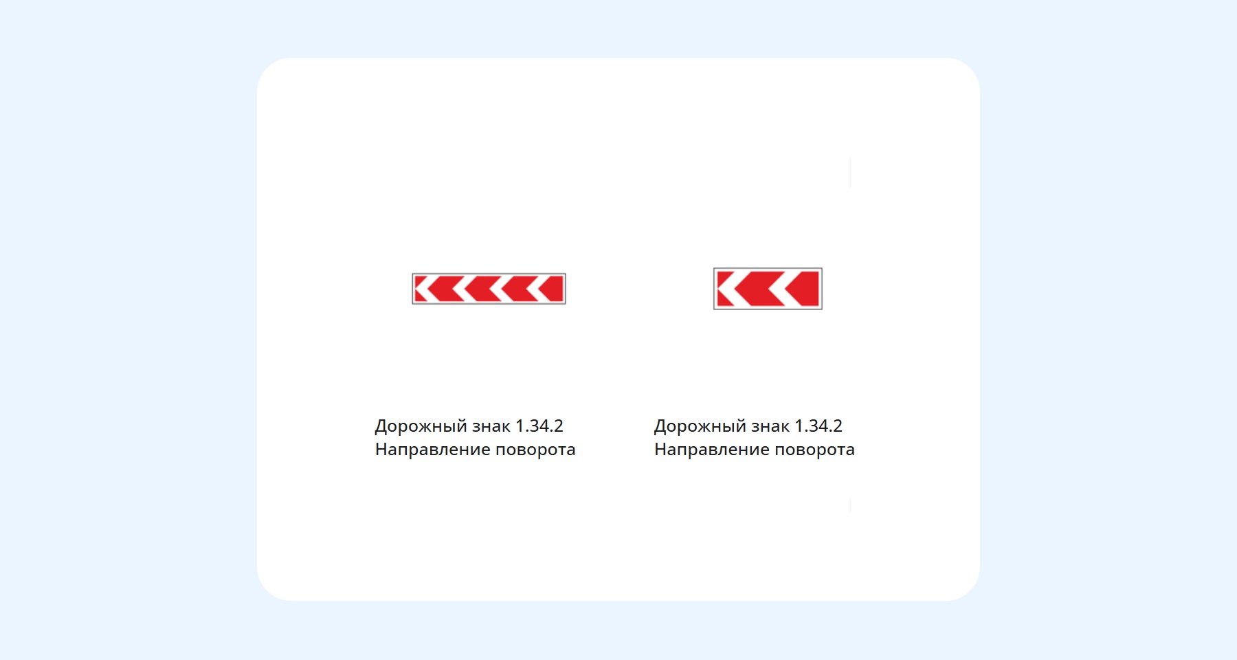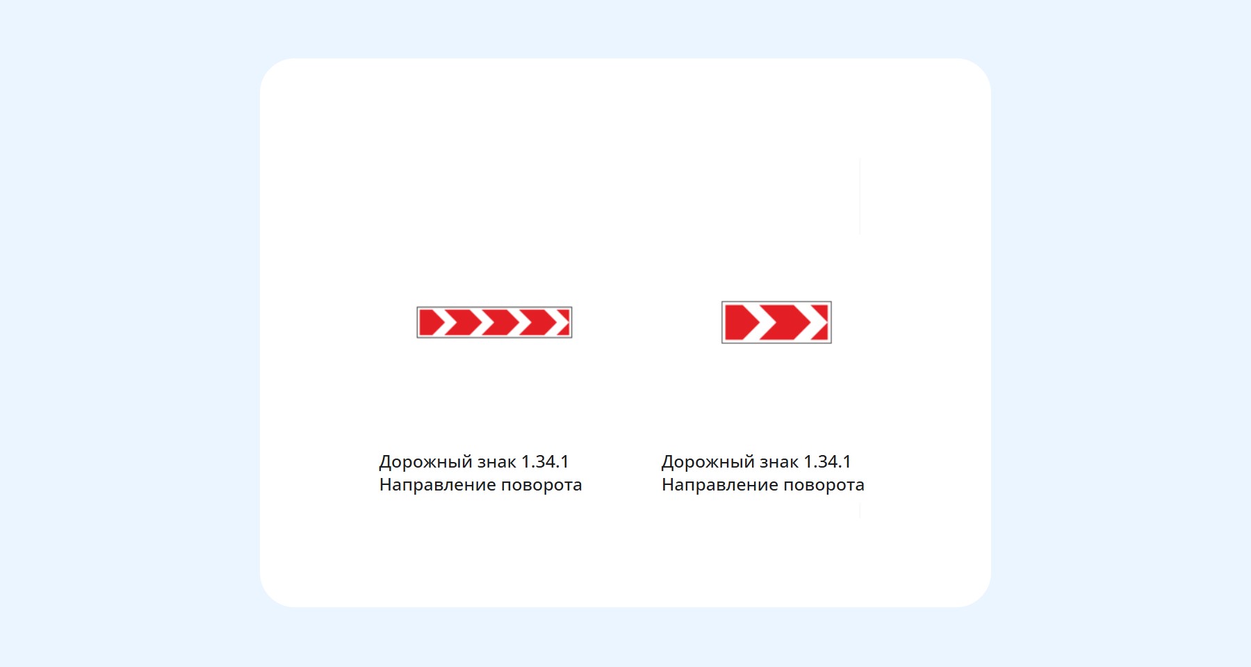 Знаки 1.34.1 и 1.34.2 «Направление поворота» — прямоугольные красные полотна с белыми стрелками вправо (1.34.1) и влево (1.34.2). Такие таблички указывают направление объезда опасного участка дороги на закруглении дороги малого радиуса с ограниченной видимостью.