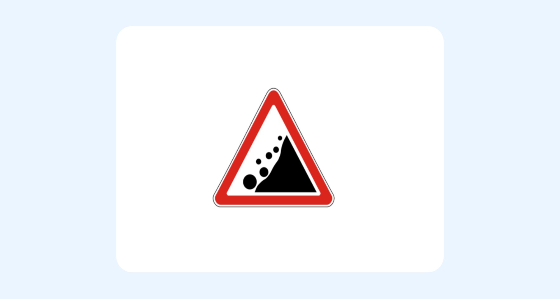 Традиционная треугольная форма знака в красном канте с черным изображением склона и падающих камней — это знак 1.28 «Падение камней». Он говорит о том, что через 50–100 м в населенном пункте и 150–300 м вне его есть риск обвалов, оползней или снежных лавин, поскольку дорога проходит вблизи каких-либо возвышенностей.